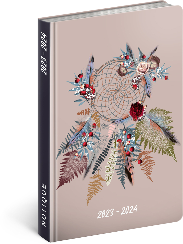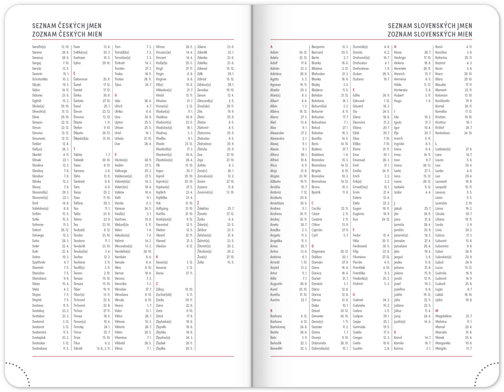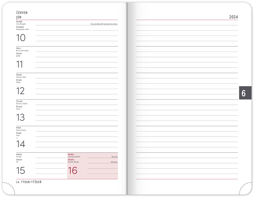 Osmnáctiměsíční diář obsahuje přehled na rok 2023 a 2024, seznam českých a slovenských jmen, česko-slovenské týdenní řádkové kalendárium se jmény a svátky a prostor na poznámky.