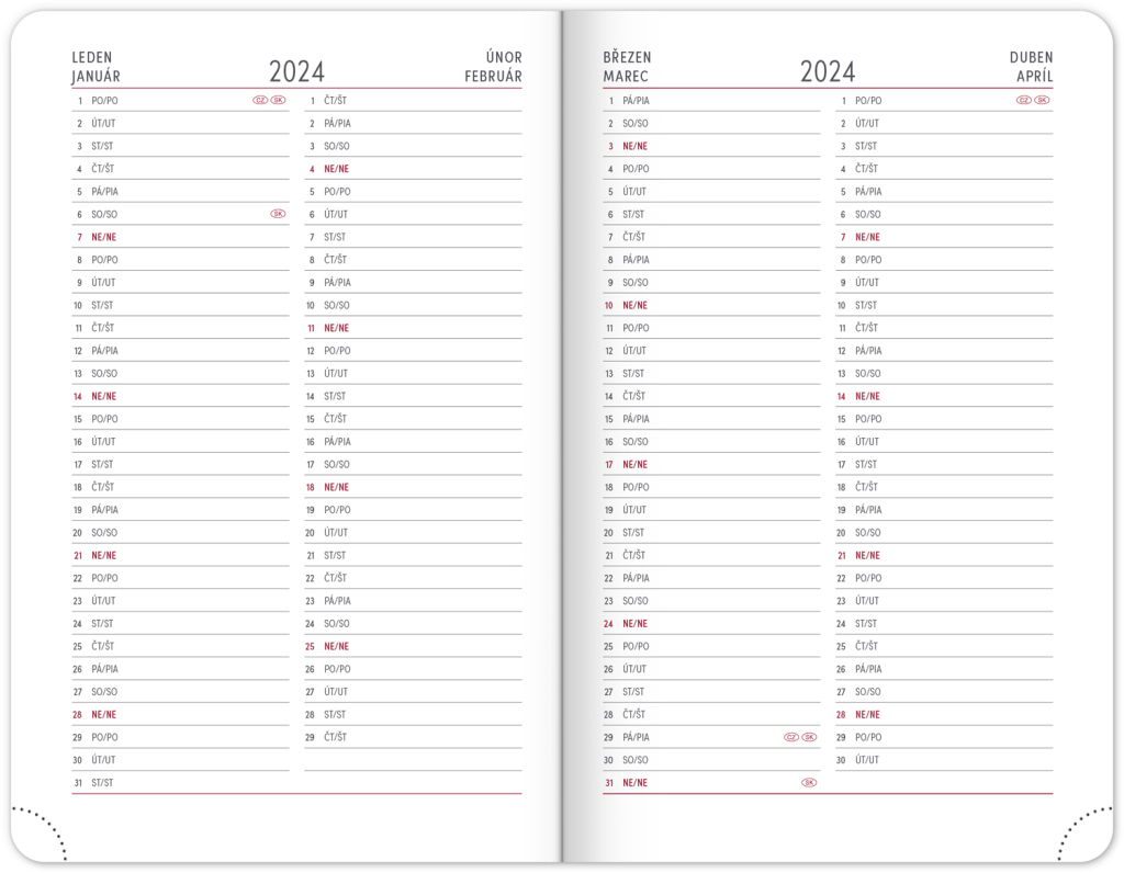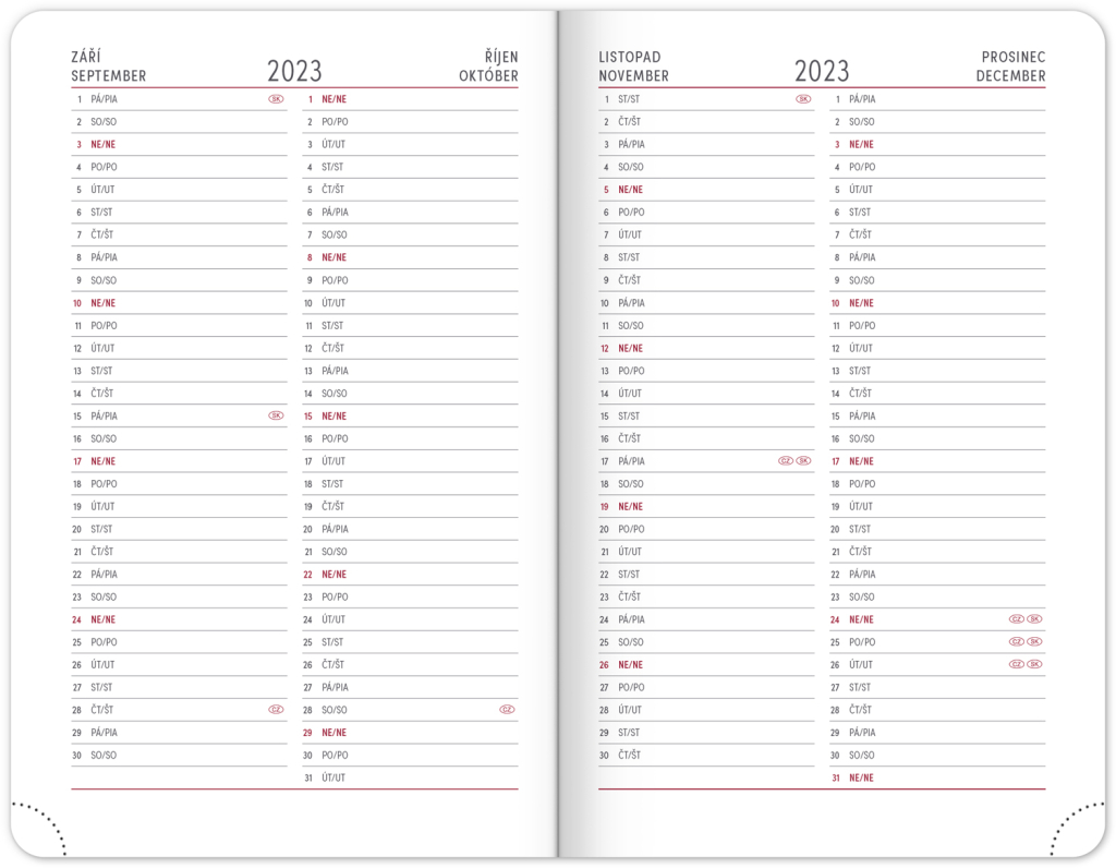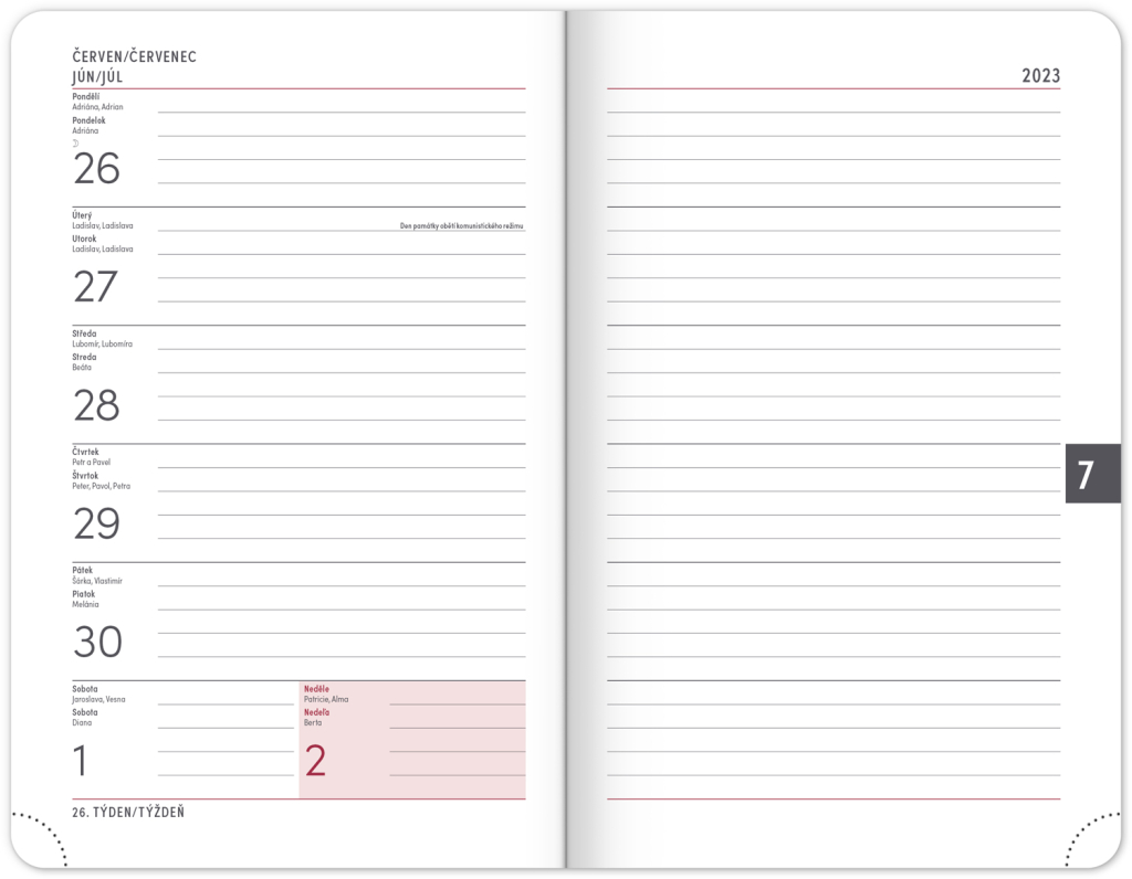 Osmnáctiměsíční diář obsahuje přehled na rok 2023 a 2024, seznam českých a slovenských jmen, česko-slovenské týdenní řádkové kalendárium se jmény a svátky a prostor na poznámky.
