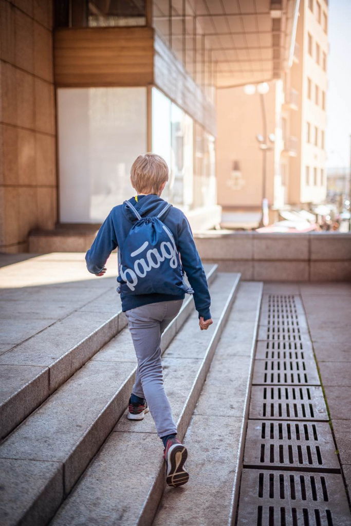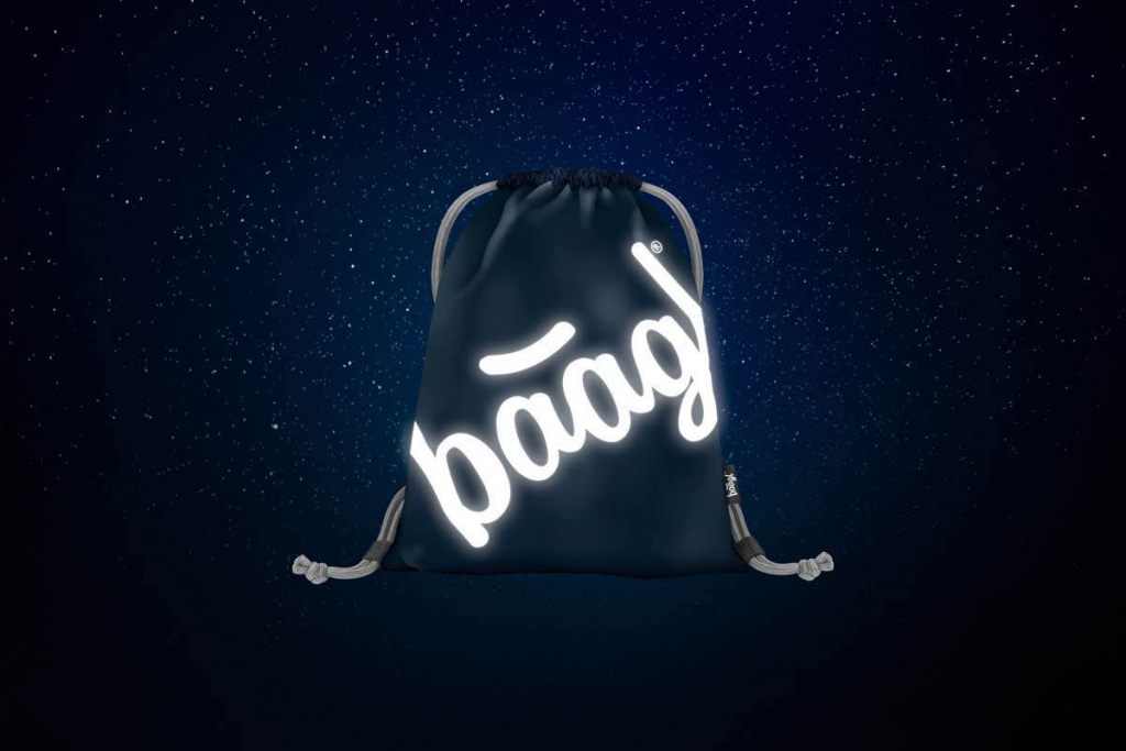 • Sáček na cvičky nebo přezůvky v modré barvě s logem Baagl, které ve tmě svítí