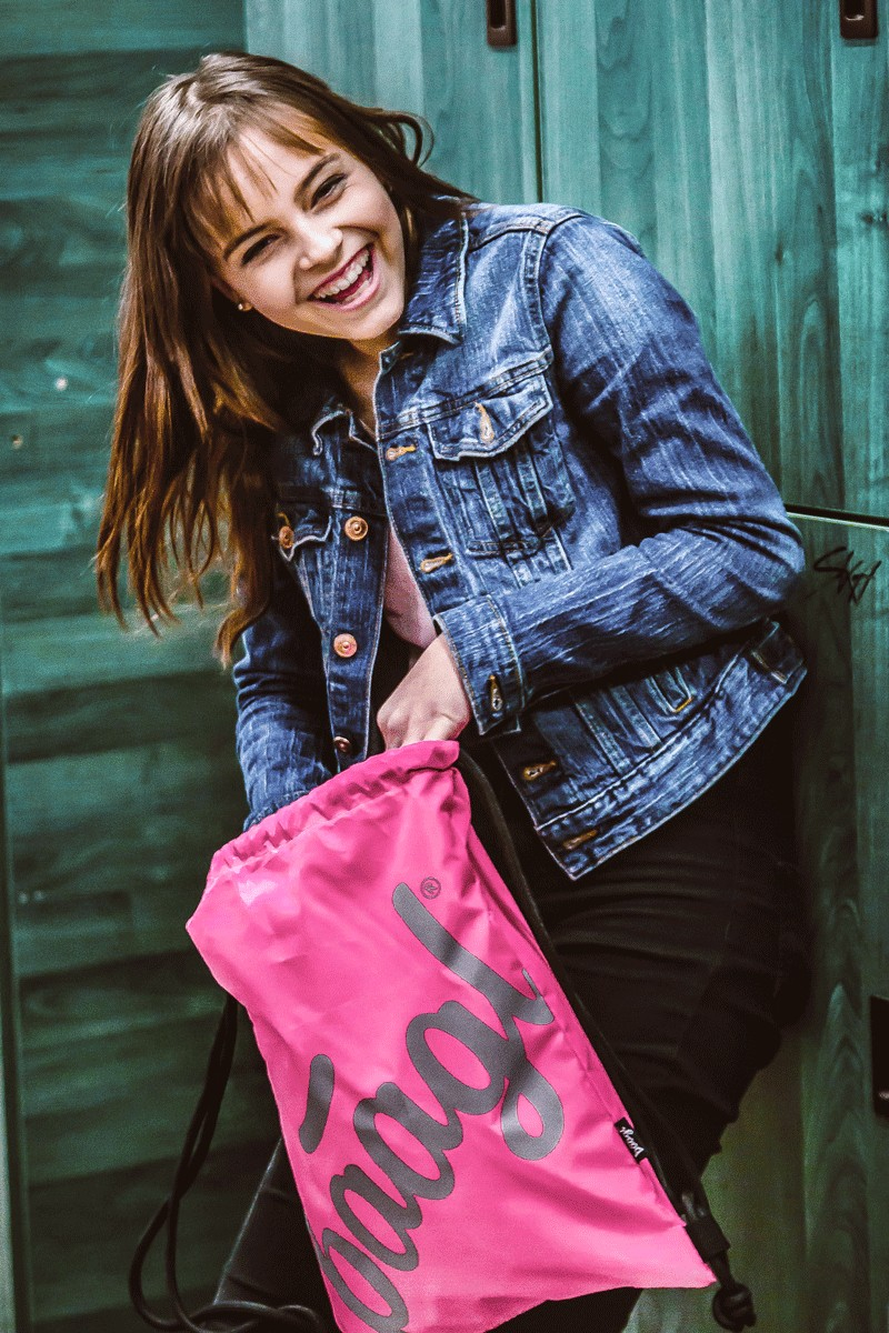Sáček na cvičky nebo přezůvky ve výrazné neonové růžové barvě s logem Baagl, které ve tmě svítí.