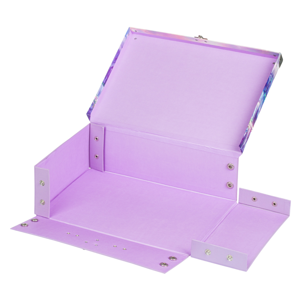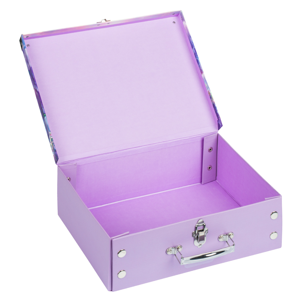 • Skládací kufřík z pevného laminovaného papíru s okovanými rohy.