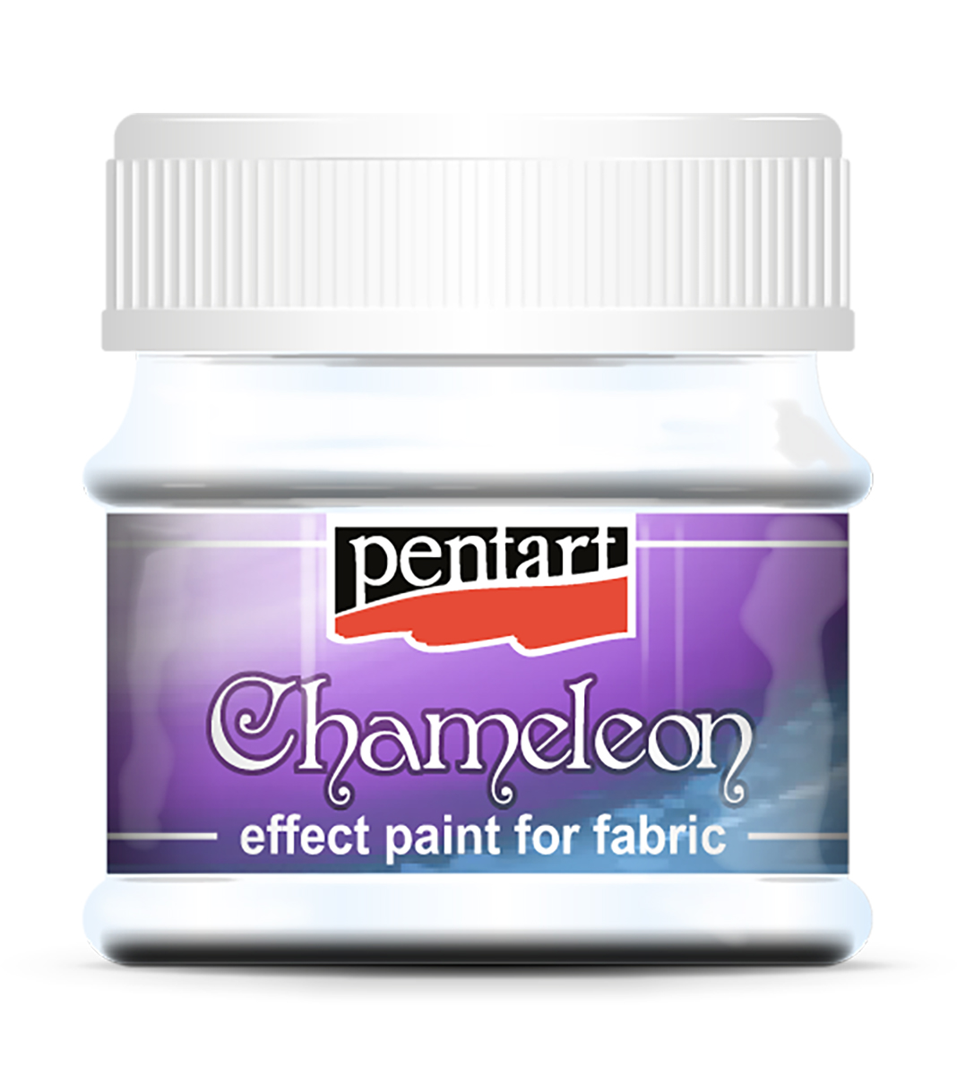 Chameleon barvou dosáhnete na tmavém textilu zvláštní kovový lesk a na světlém povrchu vás překvapí průhledná hra barev. Na konečný výsledek na vliv i barva a struktura základní textílie a množství nanesené barvy. Po uschnutí namalovaného vzoru zafixujeme žehlením po dobu asi 30 sekund přes žehlicí papír, žehličku nastavte na bavlnu. Takto ozdobená textílie se může prát z rubu na šetřící program.