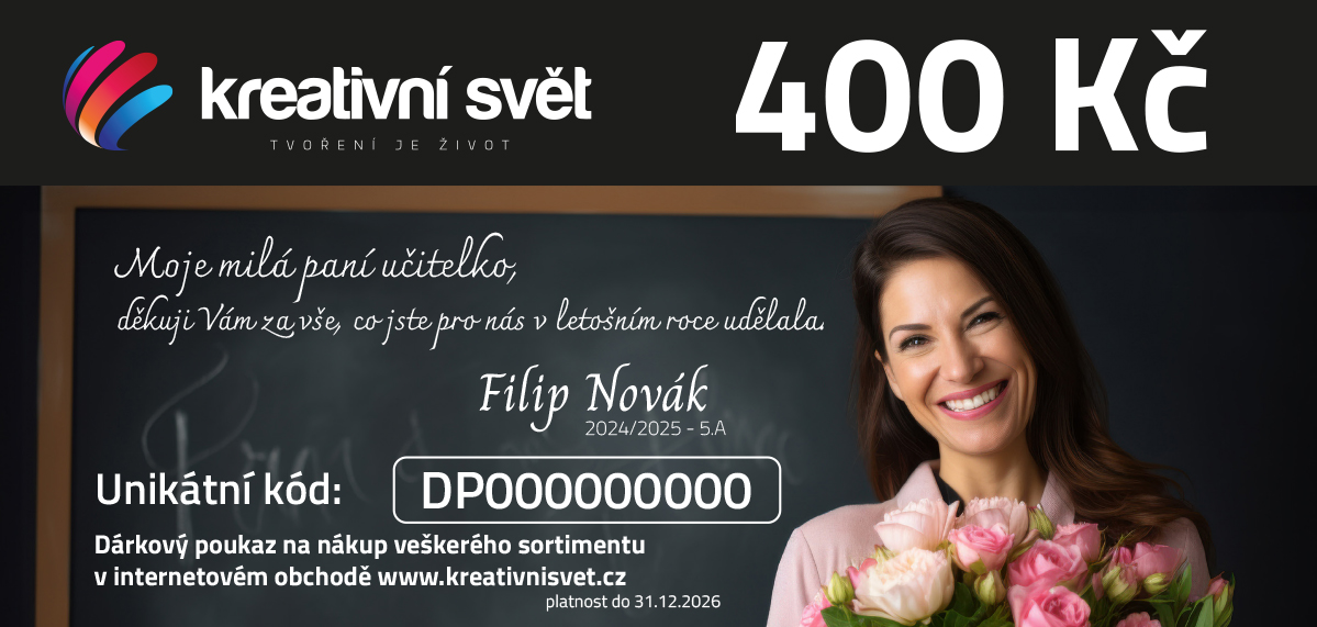 Přemýšlíte, jak letos originálně poděkovat paní učitelce za její celoroční péči, trpělivost a inspiraci? Zapomeňte na tradiční kytky, které rychle uvadnou, a věnujte dárek paní učitelce, který ji potěší mnohem víc – Poukaz do Kreativního světa!