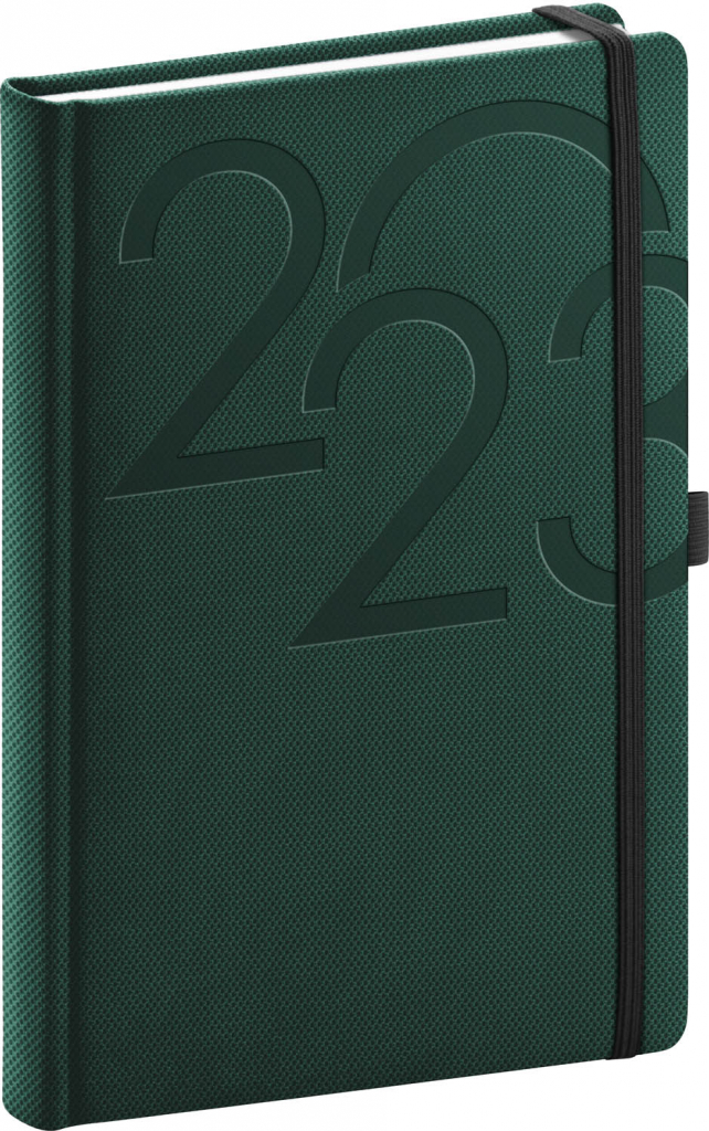 Elegantní zelený denní diář Ajax 2023 v rozměru A5. Povrch s jemnou strukturou připomínající výbrus diamantu je ideální pro všechny typy ražeb. Diář má zakulacené rohy, poutko na tužku a elastickou gumičku, sloužící k pevnému uzavření.