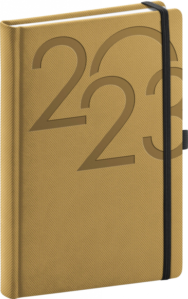 Elegantní denní diář Ajax 2023 v zlaté barvě. Povrch s jemnou strukturou připomínající výbrus diamantu je ideální pro všechny typy ražeb. Diář má zakulacené rohy, poutko na tužku a elastickou gumičku, sloužící k pevnému uzavření.