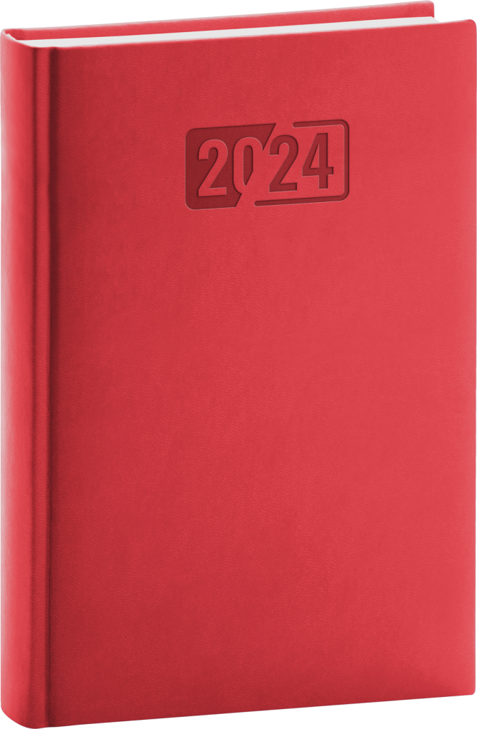 Denní diář Aprint 2024 v červené barvě. Klasika i elegance, nejžádanější povrch, na který lze snadno razit firemní loga s jemnou strukturou. Nová kolekce vsadila na osvědčené barvy, které doplňuje nová ražba letopočtu. Denní rozvrh s česko-slovenským kalendáriem a doplňkovou angličtinou, němčinou, maďarštinou a ruštinou.