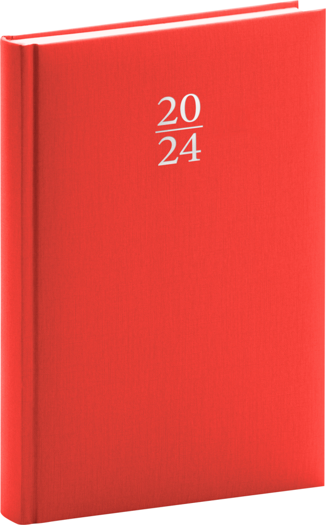 Denní diář Capys 2024 v červené barvě. Povrch imitující jemnou strukturu plátna je vhodný pro ražbu přes fólii. Atraktivní barevný odstín doplňuje ražba letopočtu. Denní rozvrh s česko-slovenským kalendáriem a doplňkovou angličtinou, němčinou, maďarštinou a ruštinou.