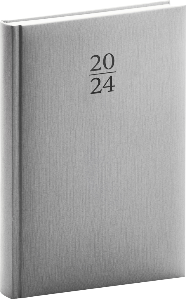 Denní diář Capys 2024 ve stříbrné barvě. Povrch imitující jemnou strukturu plátna je vhodný pro ražbu přes fólii. Atraktivní barevný odstín doplňuje ražba letopočtu. Denní rozvrh s česko-slovenským kalendáriem a doplňkovou angličtinou, němčinou, maďarštinou a ruštinou.