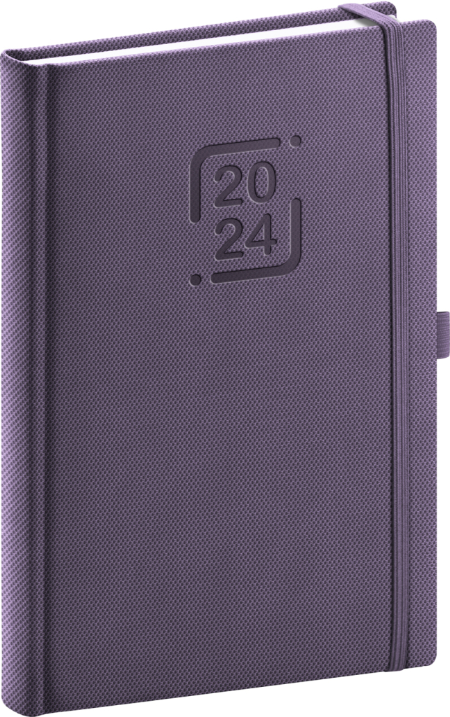 Denní diář Catanella 2024 v netradiční fialové barvě. Povrch s jemnou strukturou připomínající výbrus diamantu je vhodný pro všechny typy ražeb. Diář má zakulacené rohy, poutko na tužku a elastickou gumičku, sloužící k pevnému uzavření.