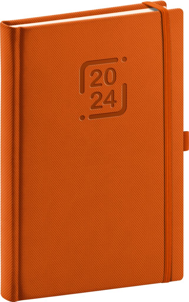 Denní diář Catanella 2024 v netradiční oranžové barvě. Povrch s jemnou strukturou připomínající výbrus diamantu je vhodný pro všechny typy ražeb. Diář má zakulacené rohy, poutko na tužku a elastickou gumičku, sloužící k pevnému uzavření.