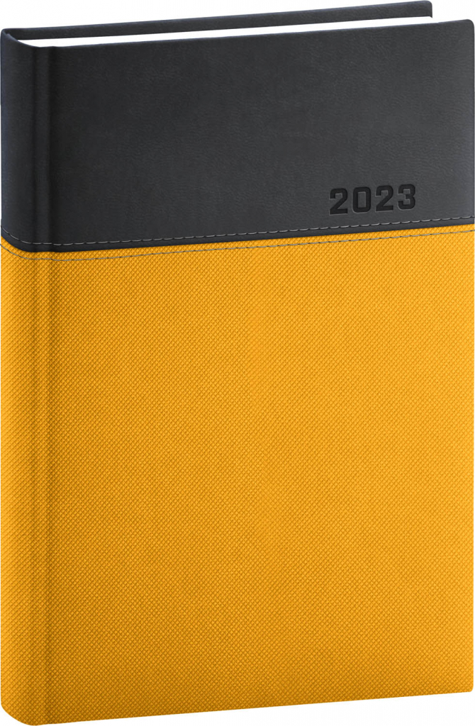 Žluto-černý denní diář Dado 2023 s měkkým povrchem a efektním prošitím v místě spoje různobarevných materiálů Nadir a Tucson. Je vhodný pro všechny druhy ražeb a horní polovina diáře je ideální i pro potisk.
