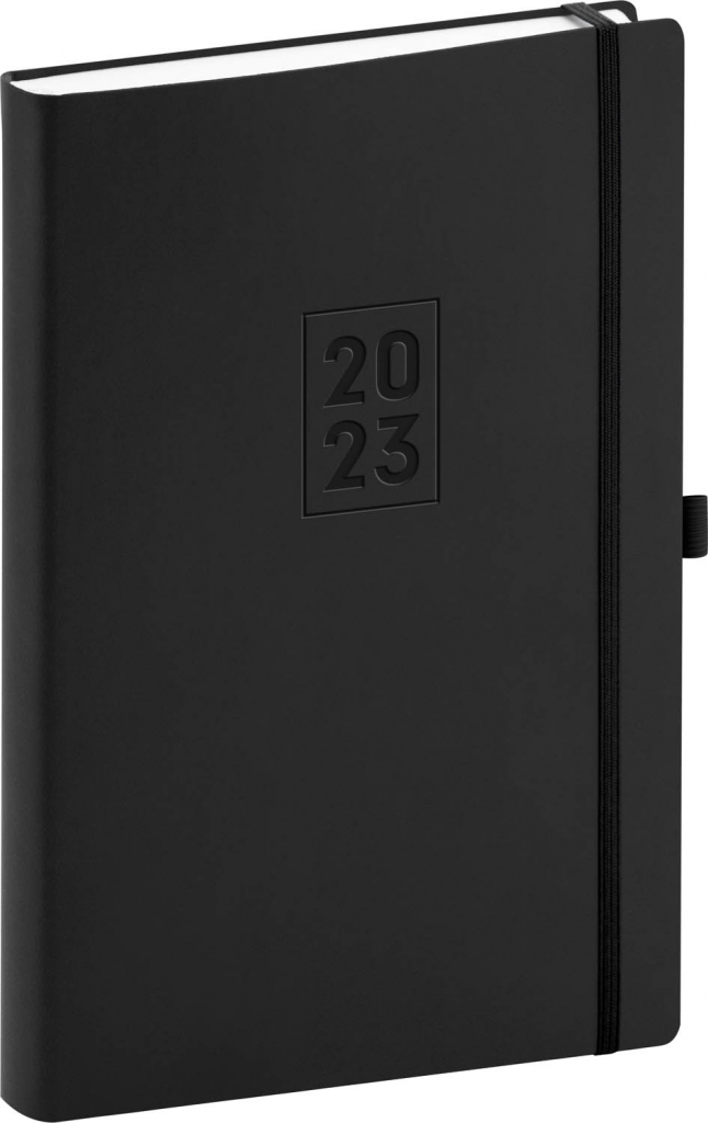 Denní diář Nox pro rok 2023 – černé desky, černá elastická gumička a poutko na pero tvoří kontrast, který zaujme na první pohled. Povrch diáře je naprosto ideální pro sleporažbu loga.