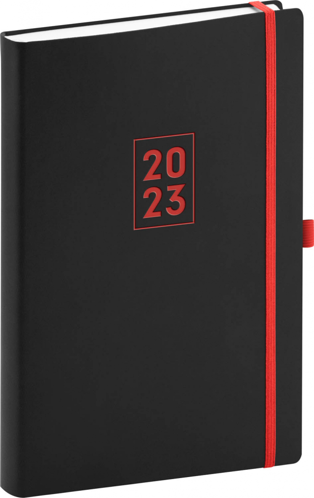 Denní diář Nox pro rok 2023 – černé desky, červená elastická gumička a poutko na pero tvoří kontrast, který zaujme na první pohled. Povrch diáře je naprosto ideální pro sleporažbu loga.