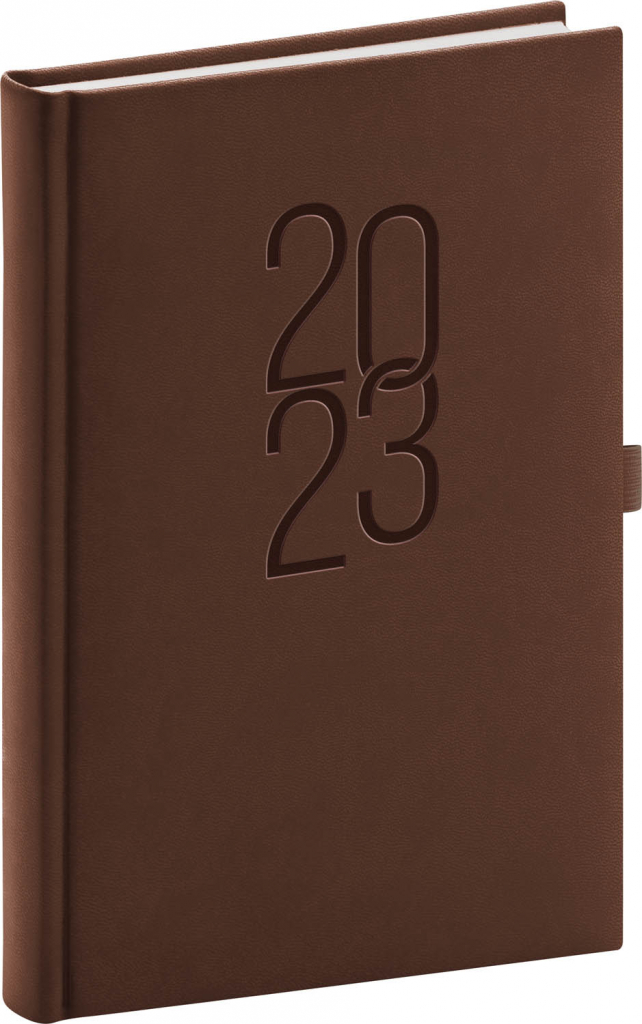 Denní diář Vivella Classic 2023 v klasické hnědé barvě s dominantní ražbou letopočtu. Povrch diáře je imitací kůže a lze do něj snadno razit i firemní logo.