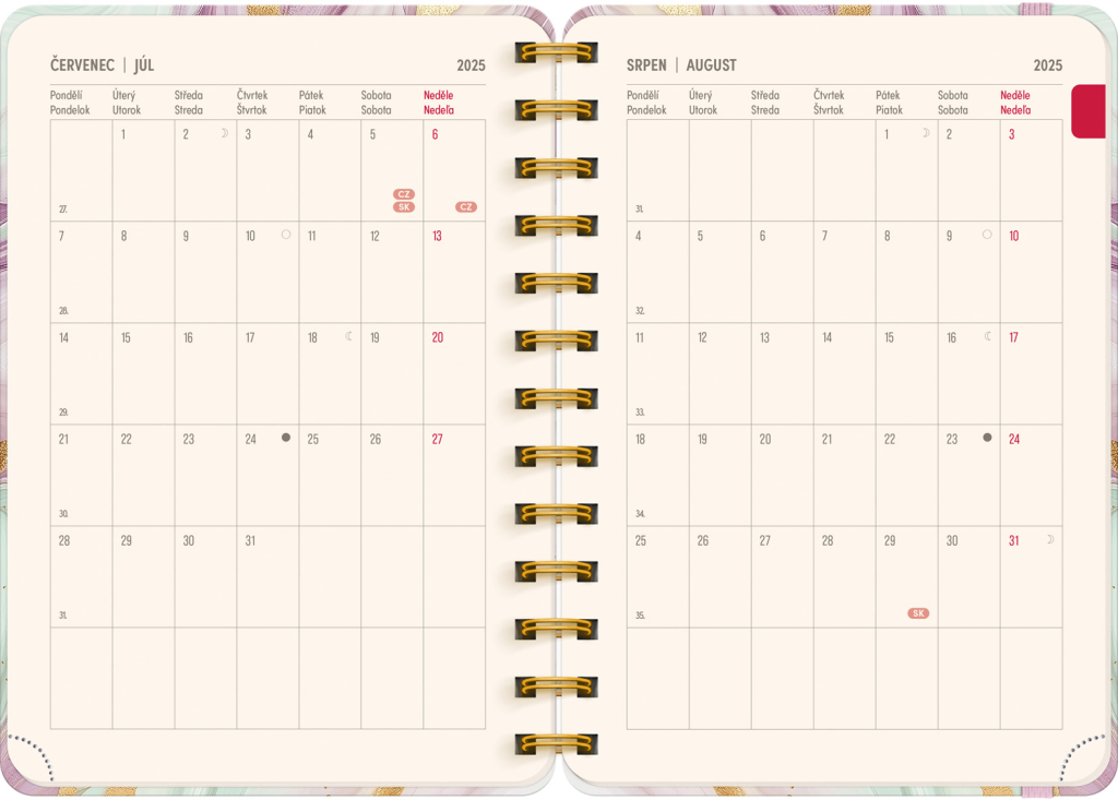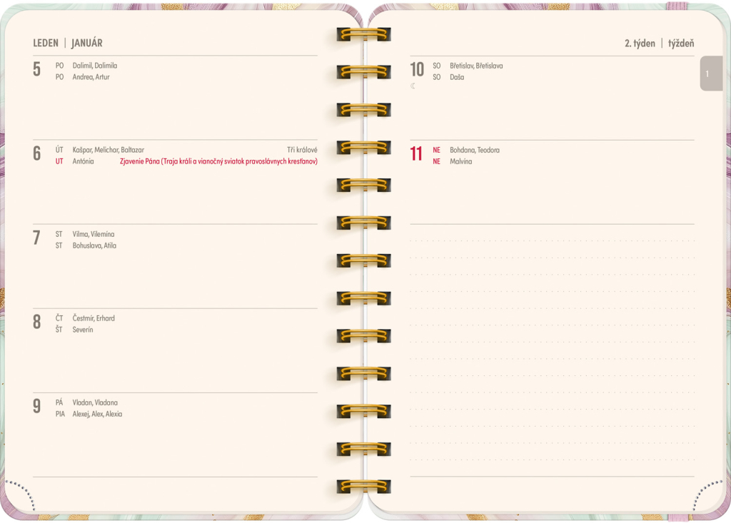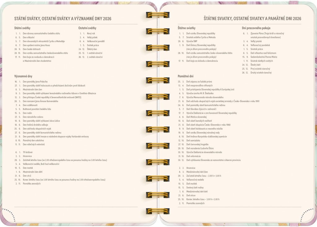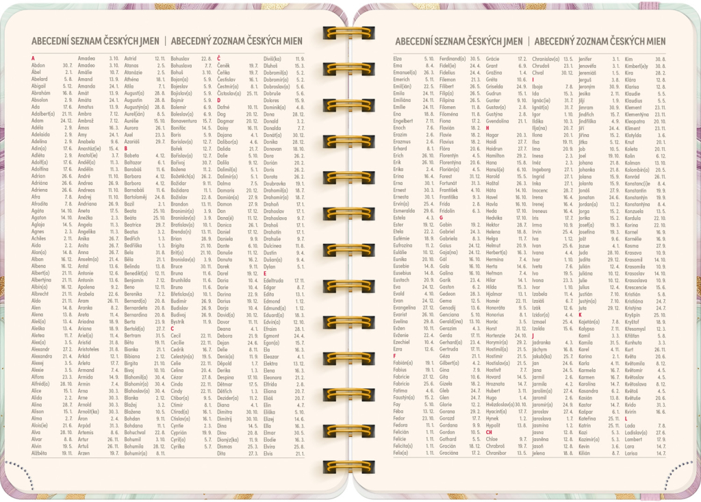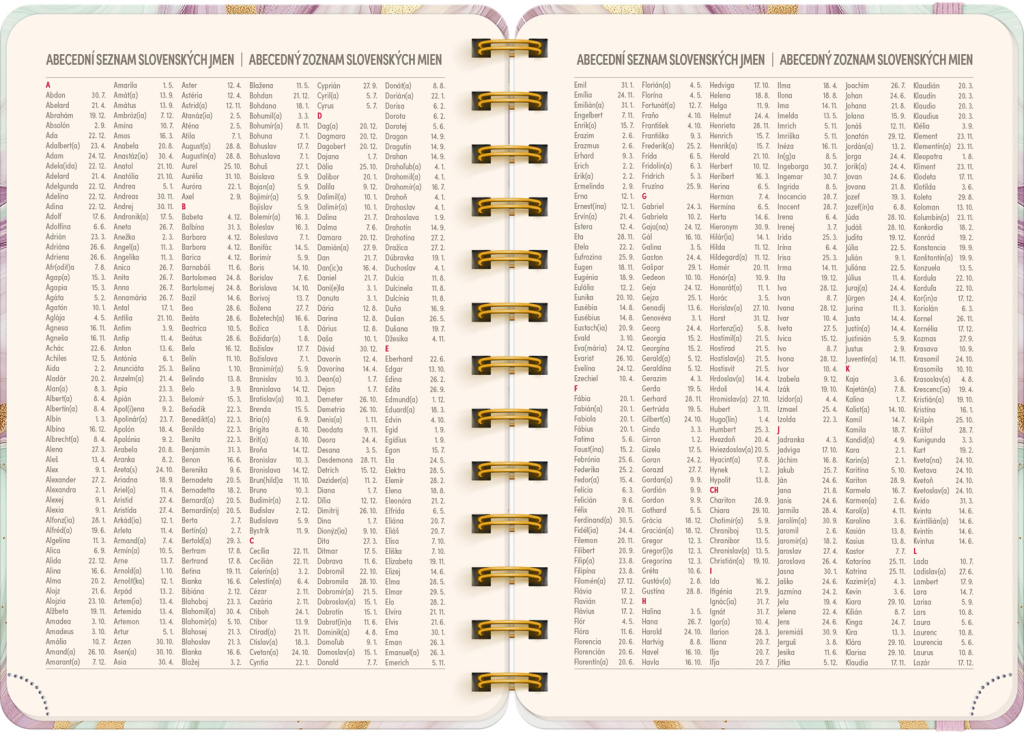 Jste často zmatení, kdo má svátek a kdy? Už žádné trapné momenty! V diáři najdete česko-slovenské kalendárium se všemi jmény a svátky – vaši blízcí ocení, že jste na ně nikdy nezapomněli.