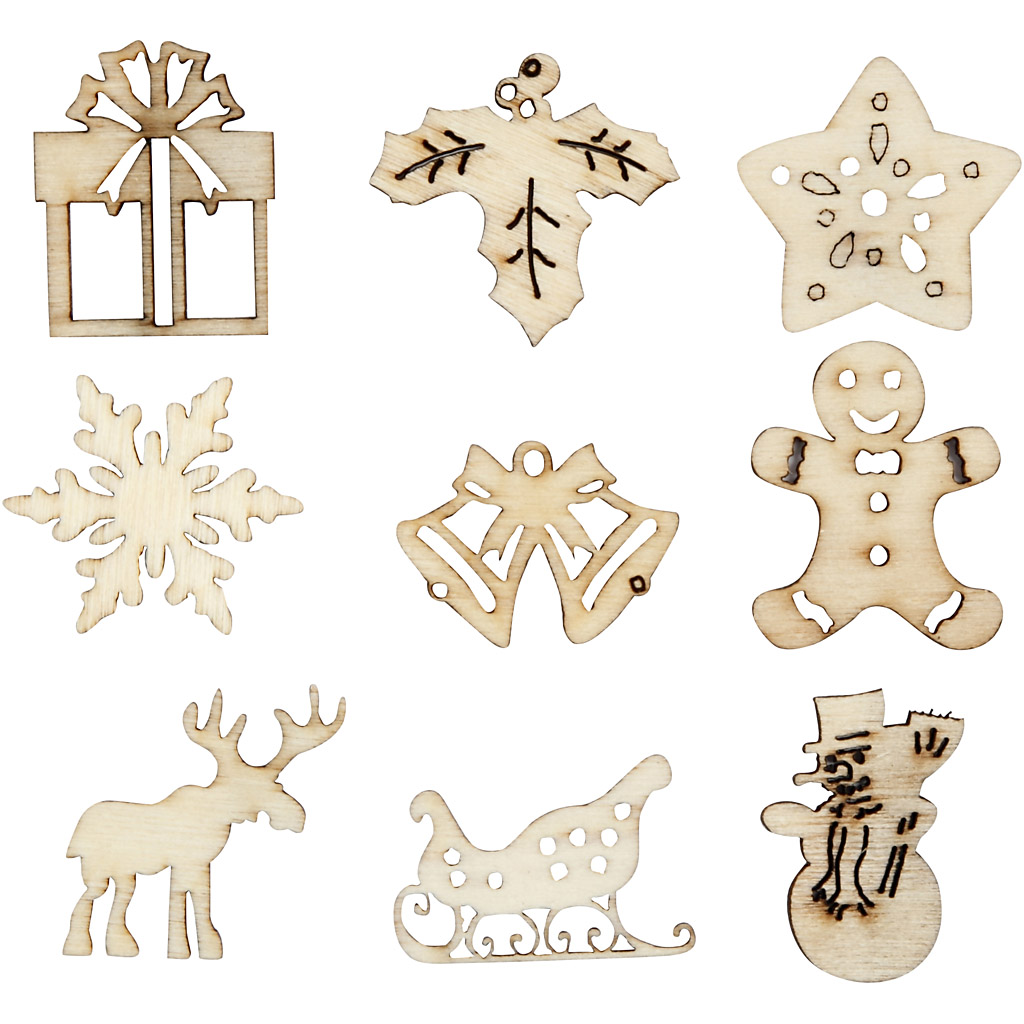 Drobné vysekávané ozdoby z dřevěné dýhy s vánočními motivy