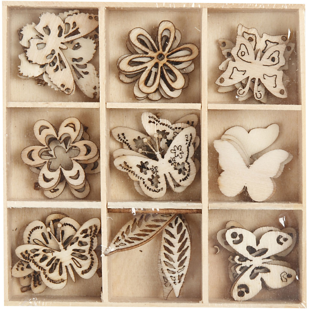Drobné vysekávané ozdoby z dřevěné dýhy ve tvaru letních motivů