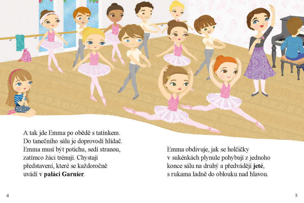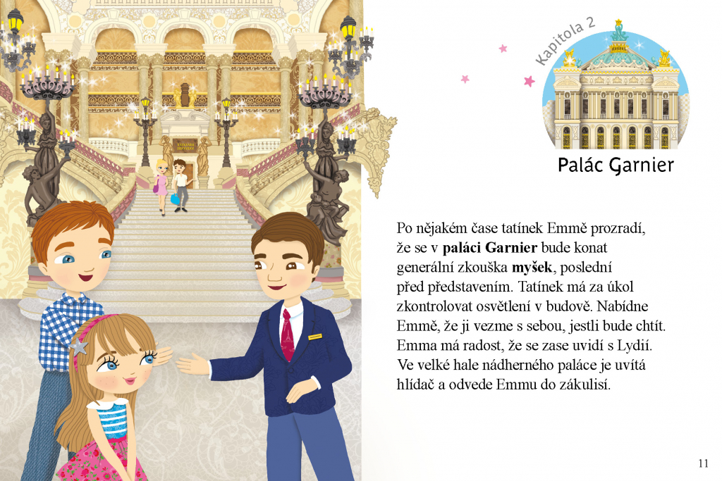 Jednoho dne vezme tatínek Emmu do práce. Je elektrikář a musí do taneční školy Národní pařížské opery, kde studují budoucí tanečnice a tanečníci zvaní myšky. Emma se tu seznámí s myškou Lydií. Po nějakém čase navštíví jejich generální zkoušku, ale Lydie na ní chybí. Vyvrkla si kotník a hrozí, že nebude vystupovat! Naštěstí Emma najde tajemnou černou perlu… Pošle ji Lydii poštou, a když pak navštíví slavnostní představení myšek, Lydie září v jejich středu. Na krku se jí skví kouzelná perla.