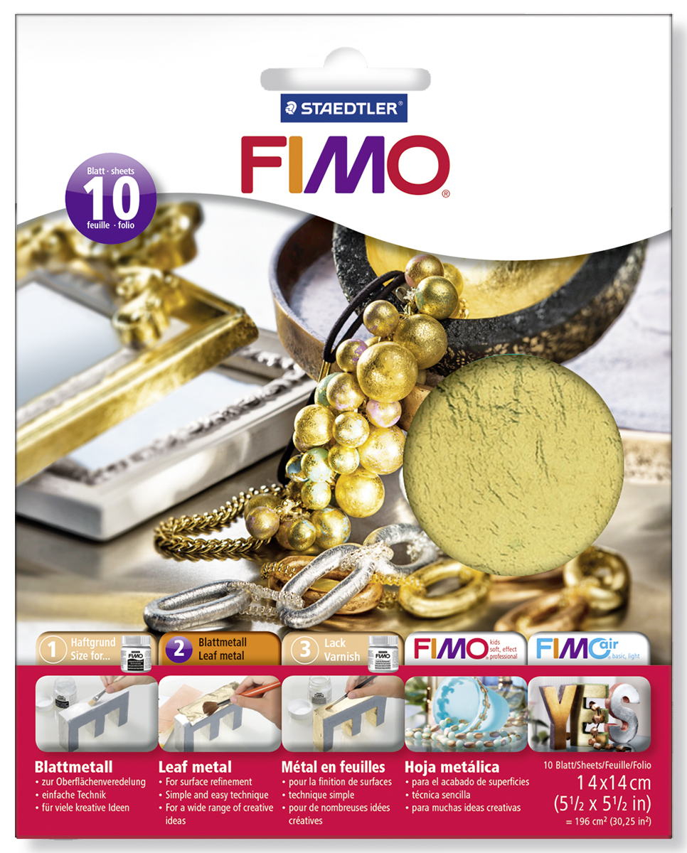 S FIMO Kovové plátky vytvoříte nádherné metalicky lesklé povrchy, které vypadají jako skutečný kov. Zlatý, stříbrný nebo třeba měděný? To už necháme na Vás.