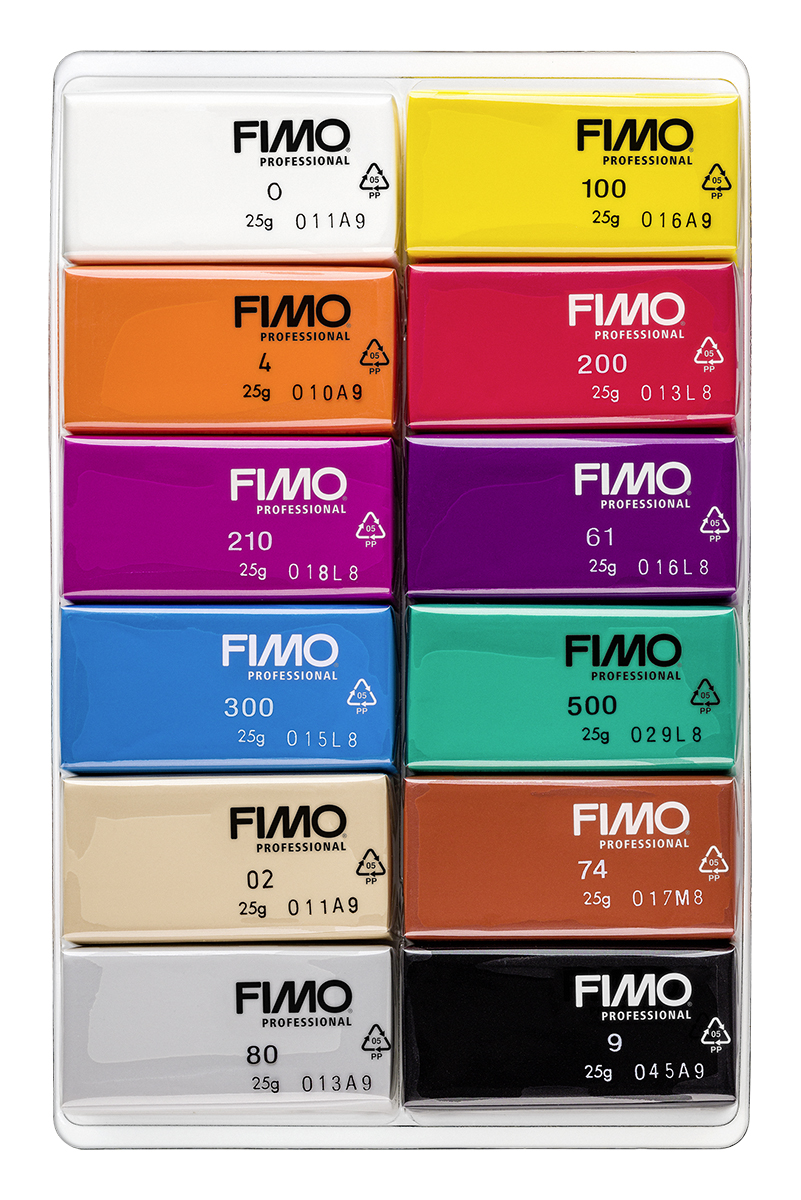 12 půlbloků FIMO professional 25 g - bílá, šampaňská, žlutá základní, červená základní, magenta základní, modrá základní, oranžová, zelená základní, fuchsiová, terakotová, delfíní šedá, černá