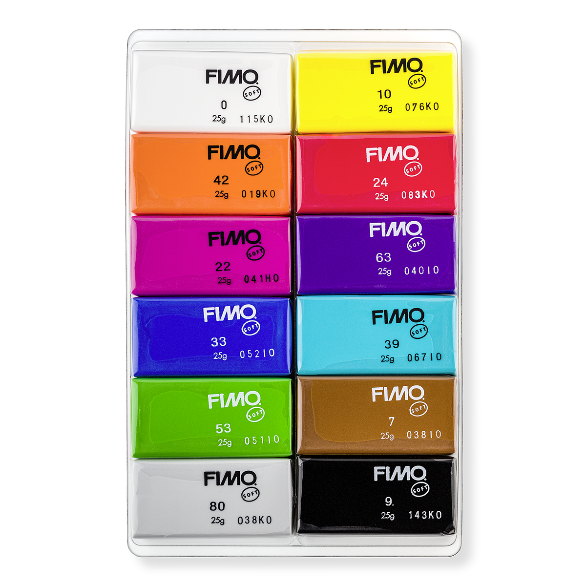 12 půlbloků FIMO Soft 25 g - bílá, žlutá, červená, oranžová, růžová, fialová, tyrkysová, modrá, zelená, hnědá, šedá a černá