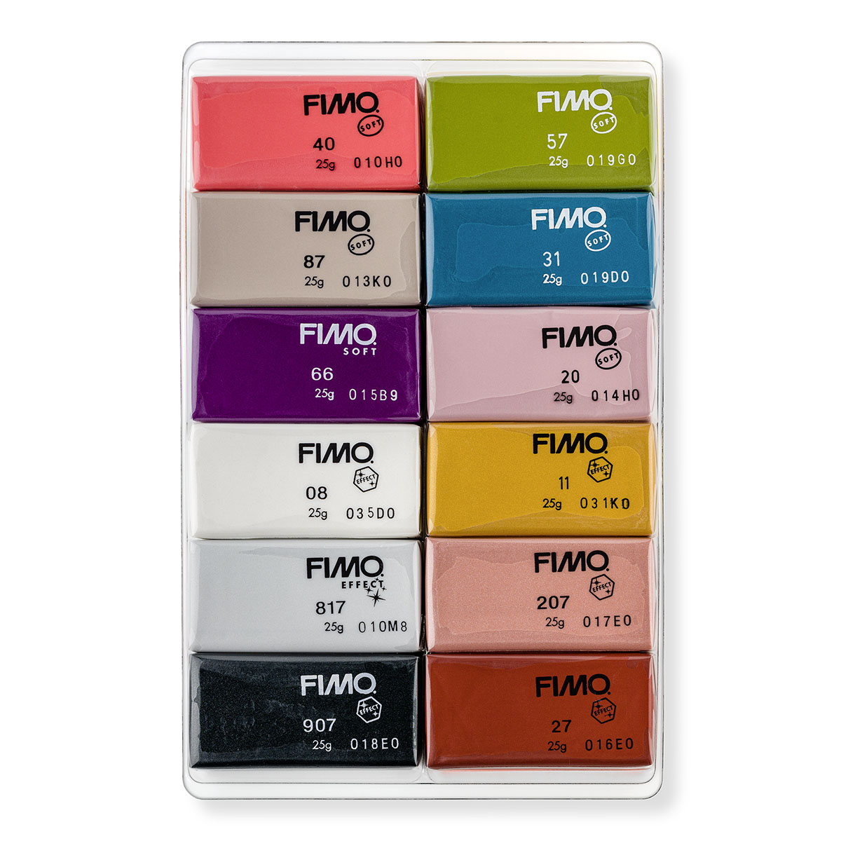 12 půlbloků FIMO Soft 25 g - perleťová, metalická zlatá, antická růžová, metalická růžovozlatá, metalická měděná, kalypso modrá, plameňák, olivová zelená, královská fialová, perleťová stříbrná, šedobéžová, perleťová černá