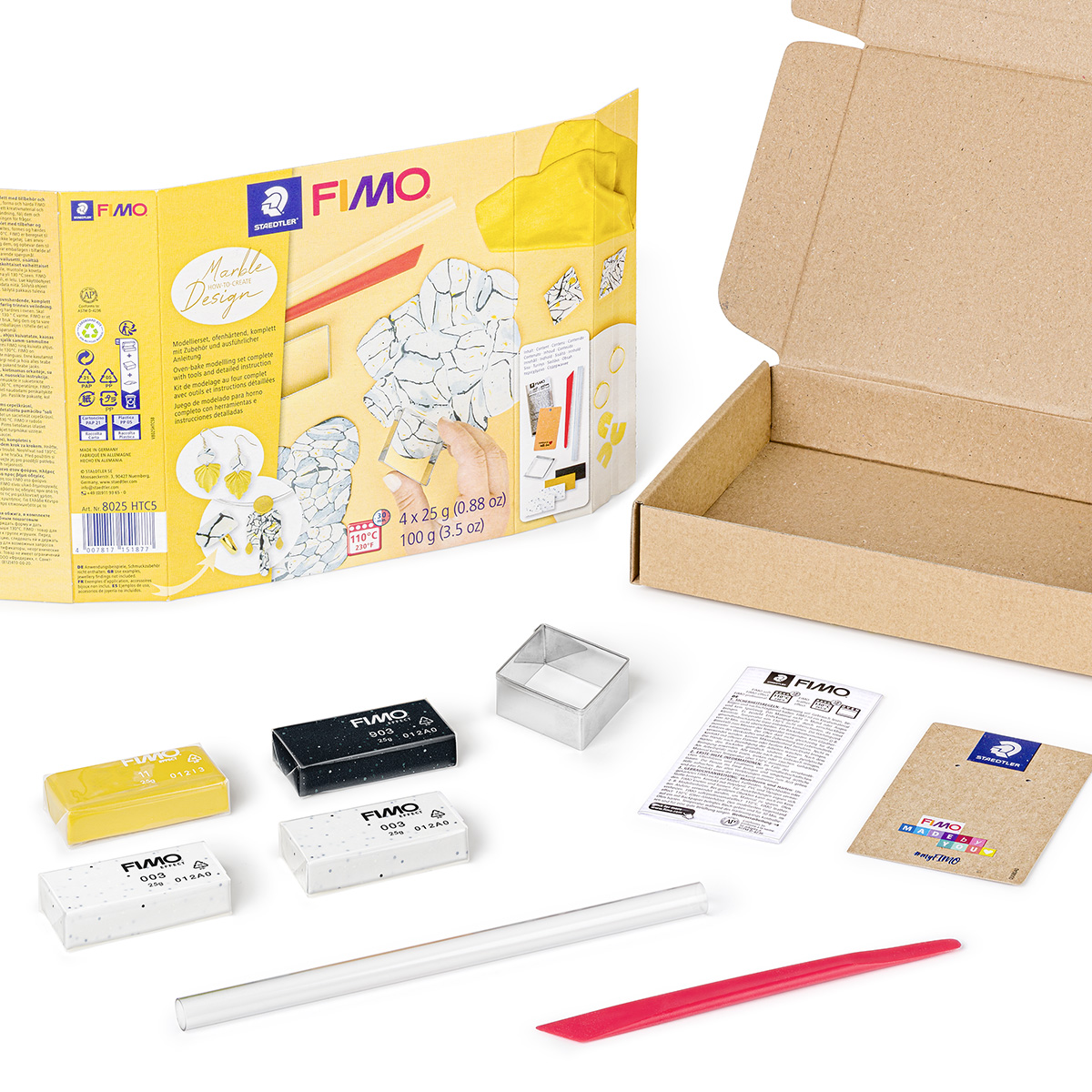 Sada obsahuje: 4x25 g poloviční Fimo bloky (metalická zlatá, černý granit a 2x bílý granit), akrylová barva černá 12 ml, 1 modelovací nástroj, váleček a instrukce.