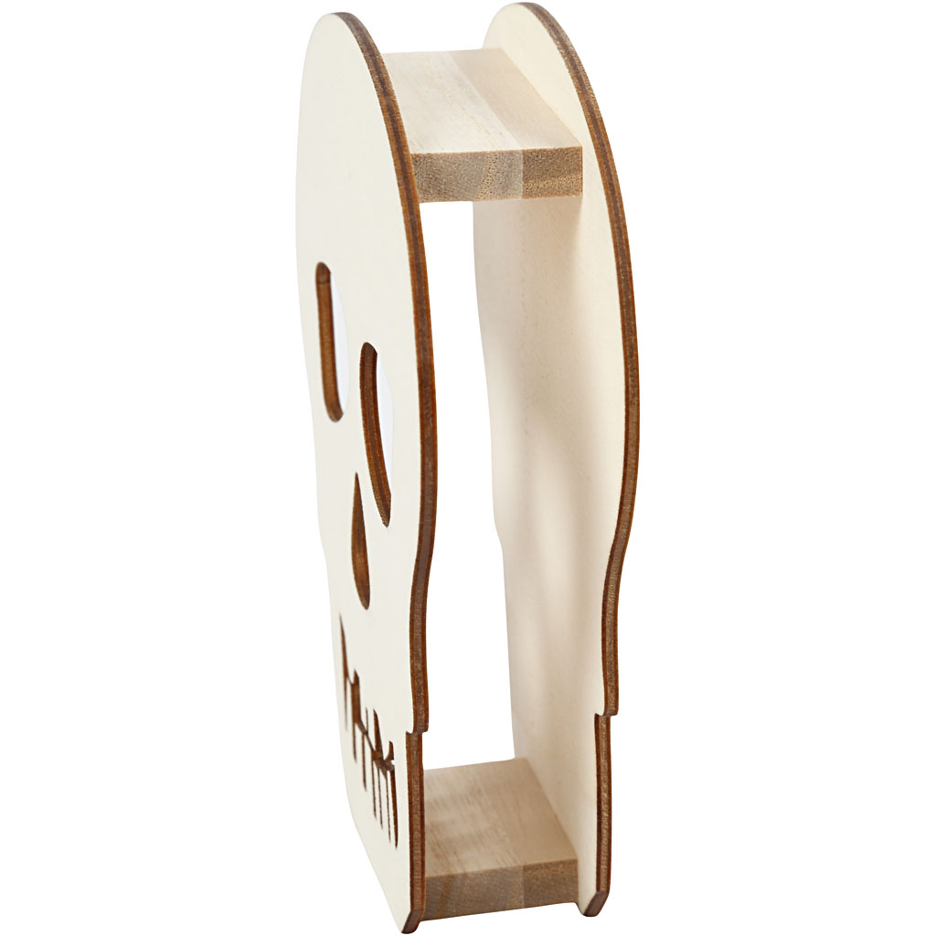 Halloweenská deorace ze dvou vrstev světlého dřeva s výřezy a podstavcem. Ozdobte ji libovolnými barvami a technikami a pro ještě strašidelnější efekt umístěte mezi dvě vrstvy dřeva LED světla, aby figurka svítila.