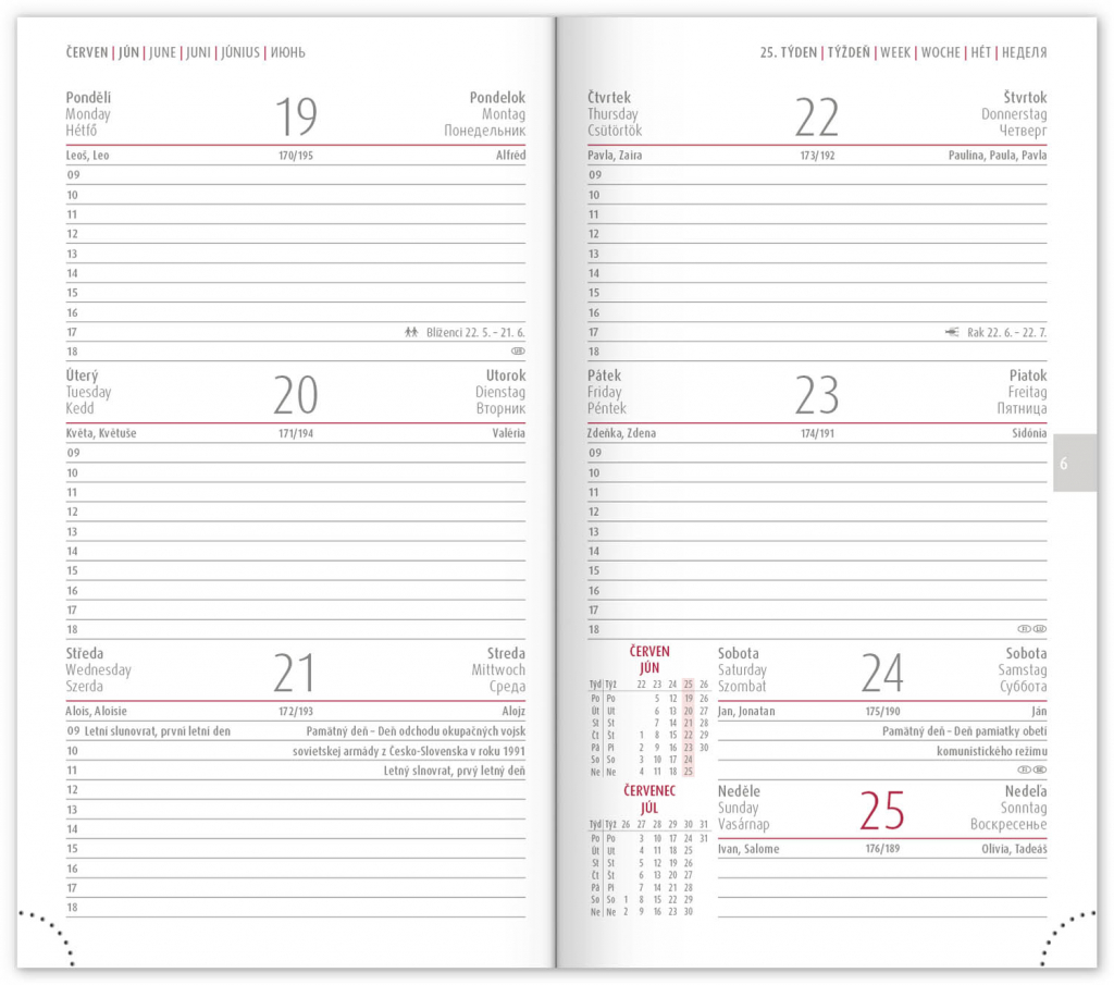 Kapesní diář Cambio Classic 2023 se sametově hebkým povrchem z lamina v červené barvě, je vhodný pro sítotisk. Týdenní rozvrh s česko-slovenským kalendáriem a doplňkovou angličtinou, němčinou, maďarštinou a ruštinou.