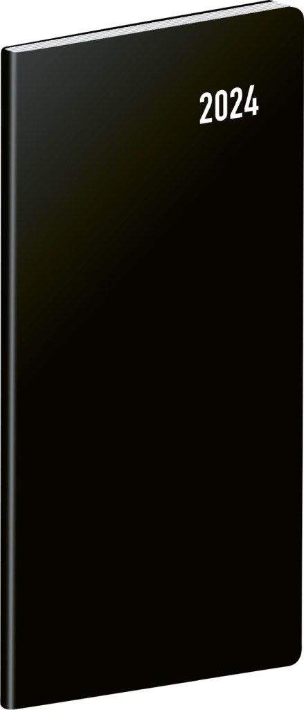 Praktický tenký diář v černé barvě s měsíčním rozložením se vejde opravdu všude. Obsahuje české kalendárium se jmény, svátky a památnými dny, pracovní kalendář, seznam jmen a přehled na rok 2024 a 2025.