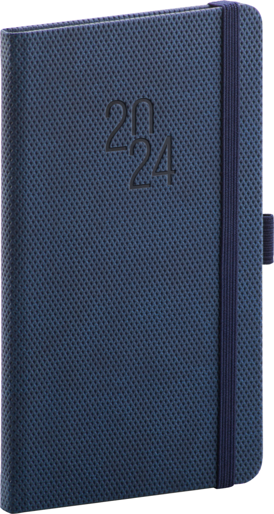 Luxusní kapesní diář Diamante 2024 v klasicky modré barvě. Povrch s jemnou strukturou připomínající výbrus diamantu je vhodný pro všechny typy ražeb. Diář má zakulacené rohy, poutko na tužku a elastickou gumičku, sloužící k pevnému uzavření.