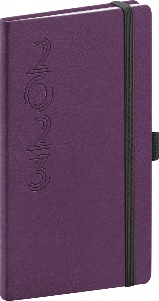 Kapesní diář Memory 2023 ve fialové barvě s výrazným letopočtem v lehce abstraktním pojetí. Týdenní rozvrh v kapesním formátus česko-slovenským kalendáriem a doplňkovou angličtinou, němčinou, maďarštinou a ruštinou.