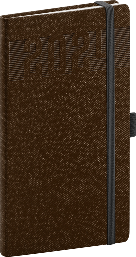 Kapesní diář Silhouette 2024 s výrazným letopočtem v hnědé barvě. Týdenní rozvrh v kapesním formátu s česko-slovenským kalendáriem a doplňkovou angličtinou, němčinou, maďarštinou a ruštinou.
