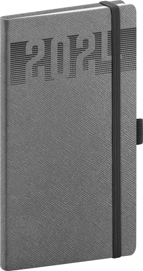 Kapesní diář Silhouette 2024 s výrazným letopočtem ve stříbrné barvě. Týdenní rozvrh v kapesním formátu s česko-slovenským kalendáriem a doplňkovou angličtinou, němčinou, maďarštinou a ruštinou.