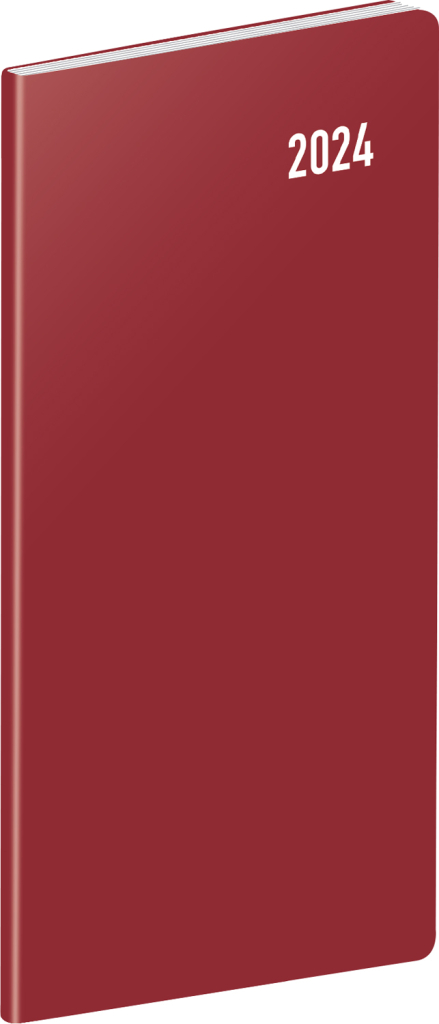 Praktický tenký diář ve vínové barvě s měsíčním rozložením se vejde opravdu všude. Obsahuje české kalendárium se jmény, svátky a památnými dny, pracovní kalendář, seznam jmen a přehled na rok 2024 a 2025.