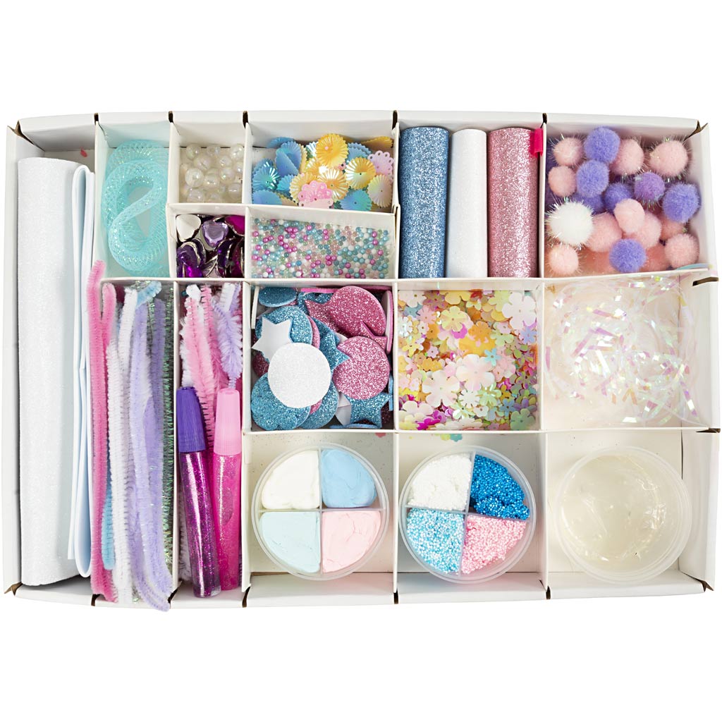 Pěnovka EVA, třpytivá pěnovka EVA, čističe dutinek, třpytivé čističe dutinek, pěnová modelovací hmota Foam Clay, hedvábná modelovací hmota Silk clay, lepidlo, tvary z pěnovky EVA, květinové flitry, duhové plastové proužky, plastová trubička, kamínky, korálky, skleněné korálky, kulaté flitry, třpytivý papír, bambulky.