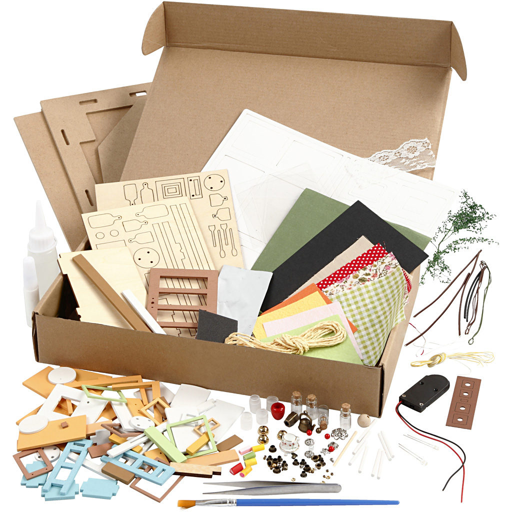 Obsahuje: dřevěné díly pro kuchyň a nábytek, drobné ozdobné předměty (nádobí atd.) a lampa s žárovkou (včetně baterií). Navíc - praktickou pinzetu, lepidlo, barvu a štětec.