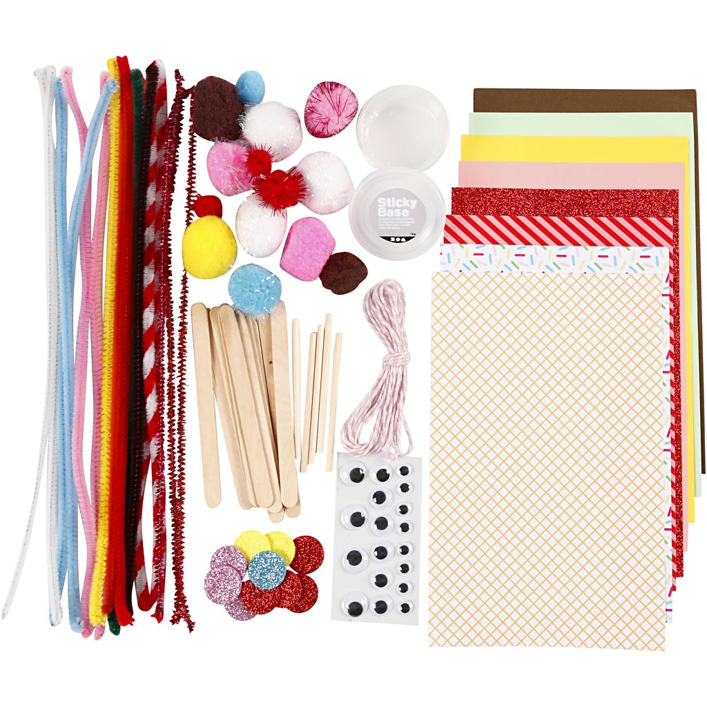 Sada obsahuje: vzorovaný papír ve 3 provedeních, obyčejný papír ve 4 barvách, lepidlo, třpytivý papír, různé velikosti samolepicích očí, dřevěné tyčinky ve 2 velikostech a bavlněný provázek, dále čističe dutinek, bambulky a samolepicí kruhy z EVA pěny ve směsi pestrých a třpytivých barev.
