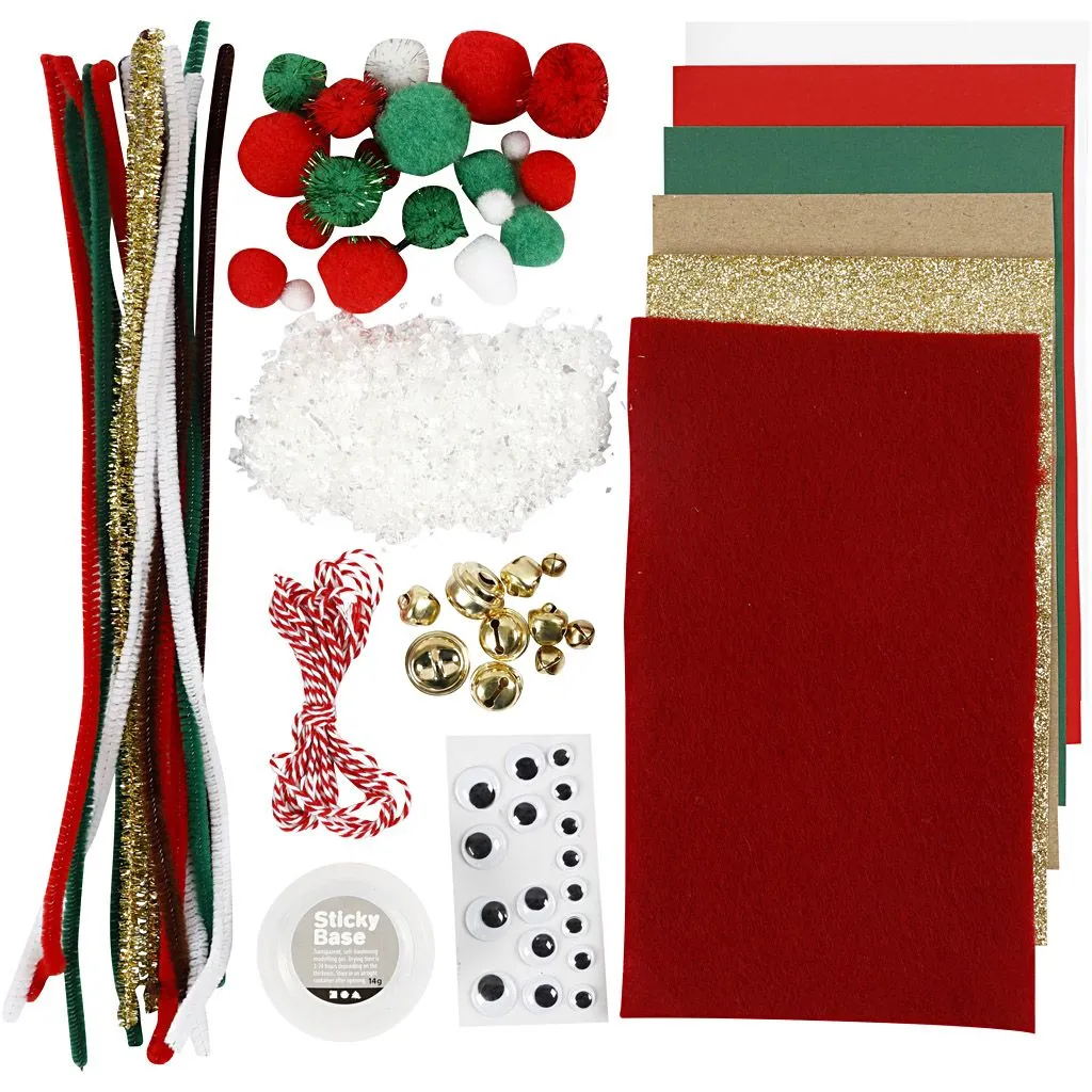 Sada obsahuje: lepidlo, plsť, přírodní papír, karton, třpytivý papír, kovové čističe dutinek, čističe trubek, samolepicí oči, umělý sníh, malé zlaté zvonky, bavlněno šňůru a bambulky.
