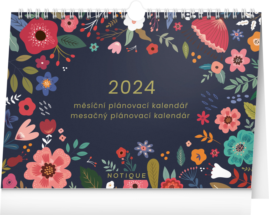 Designový stolní kalendář s lehkou kroužkovou vazbou doplňuje decentní motiv květin. Obsahuje měsíční kalendárium v češtině a slovenštině, velký prostor na poznámky a přehled svátků a památných dnů. Praktický háček umožňuje i zavěšení kalendáře na zeď.