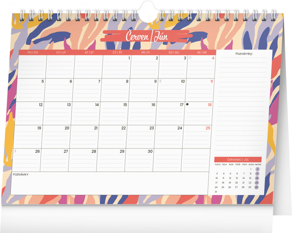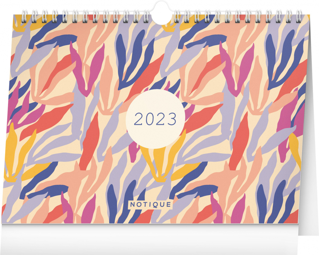 Designový stolní kalendář s lehkou kroužkovou vazbou. Obsahuje měsíční kalendárium v češtině a slovenštině, prostor na poznámky a přehled svátků a památných dnů. Praktický háček umožňuje i zavěšení kalendáře na zeď.