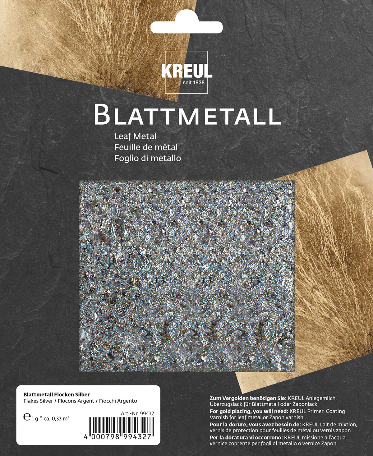 Stříbrný lesk je nenapodobitelně krásný a proměňuje předměty v nádherné unikáty. Se správnými základy a trochou šikovnosti lze tradiční zušlechťovací techniku z oblasti restaurování využít i pro kreativce. K tomuto účelu se na dekorované předměty nanáší speciální lepidlo na metalické plátky KREUL a metalické plátky nebo vločky. Ty jsou k dispozici v barvách zlata, stříbra a mědi. Díky tomu je možné dosáhnout vysoce lesklých efektů na mnoha površích ze dřeva, skla, kartonu, porcelánu a mnoha dalších. Jednoduché doplňky, jako jsou rámy na obrazy, dřevěné díly nebo mísy, se tak promění v luxusně vypadající umělecké předměty.