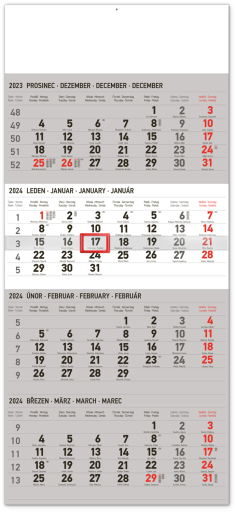 Praktický čtyřměsíční plánovací kalendář s náhledem čtyř měsíců současně a orientační lištou s posuvným jezdcem. Obsahuje kalendárium s českými jmény a světovými svátky.