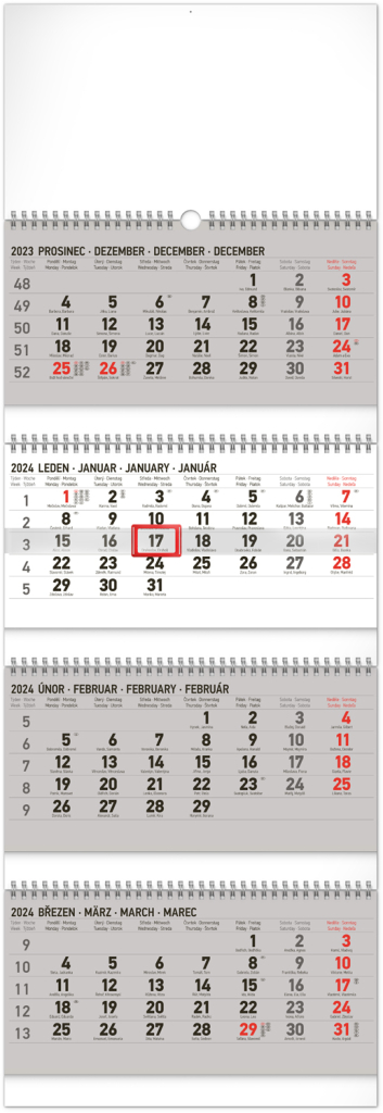 Praktický čtyřměsíční kalendář s plochou pro potisk a náhledem čtyř měsíců současně můžete díky dvojité spirále pohodlně složit do obálky velikosti A4. Kalendárium obsahuje česká jména a světové svátky. Díky volné ploše pro potisk se může stát zcela originálním předmětem pro firmy.