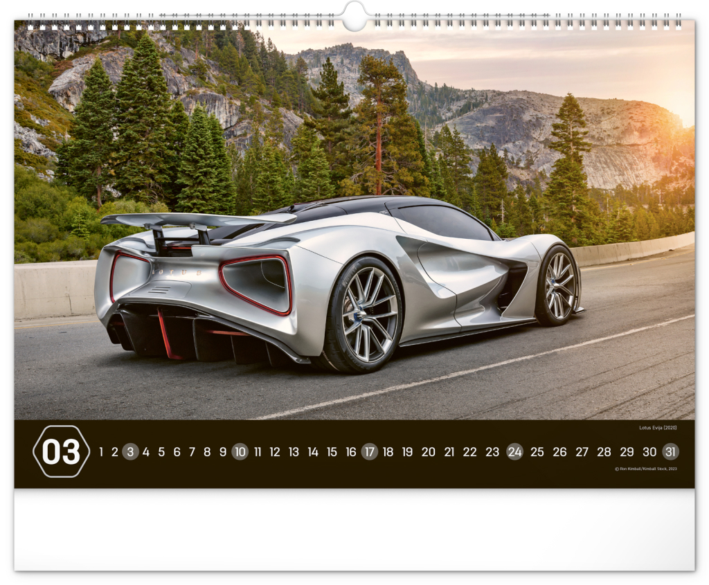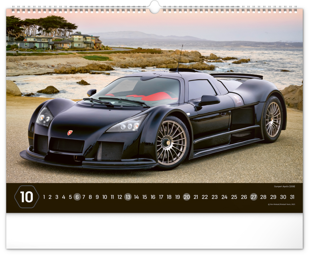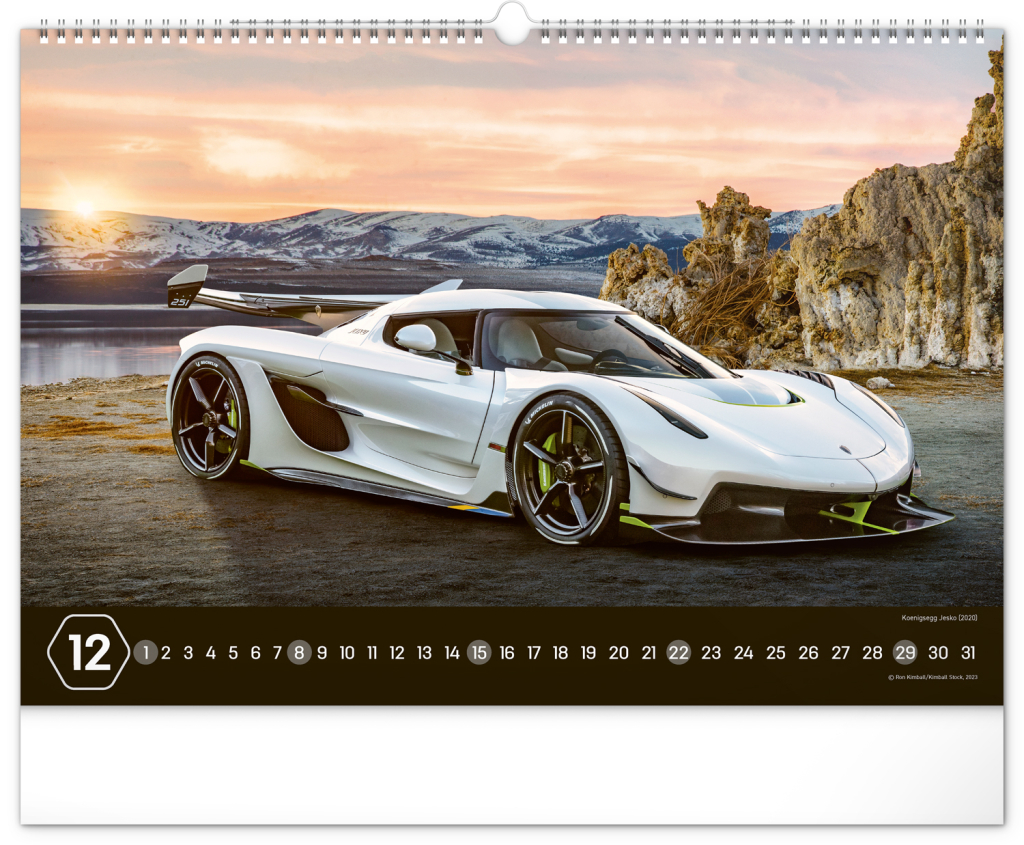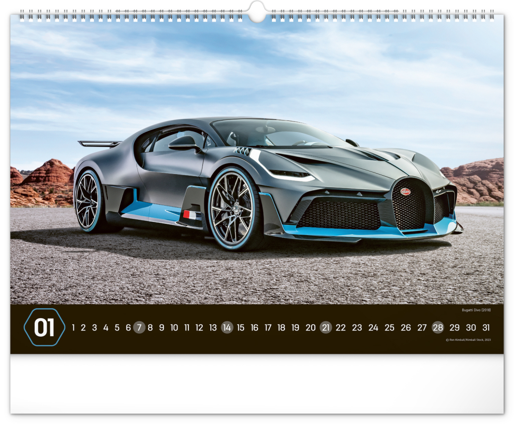 Nástěnný kalendář pro všechny milovníky rychlé jízdy a sportovních vozů. Dvanáct snímků luxusních sportovních vozů z celého světa na stránkách kalendáře v šířkovém formátu. Fotografie jsou doplněny univerzálním kalendáriem na černém pozadí.