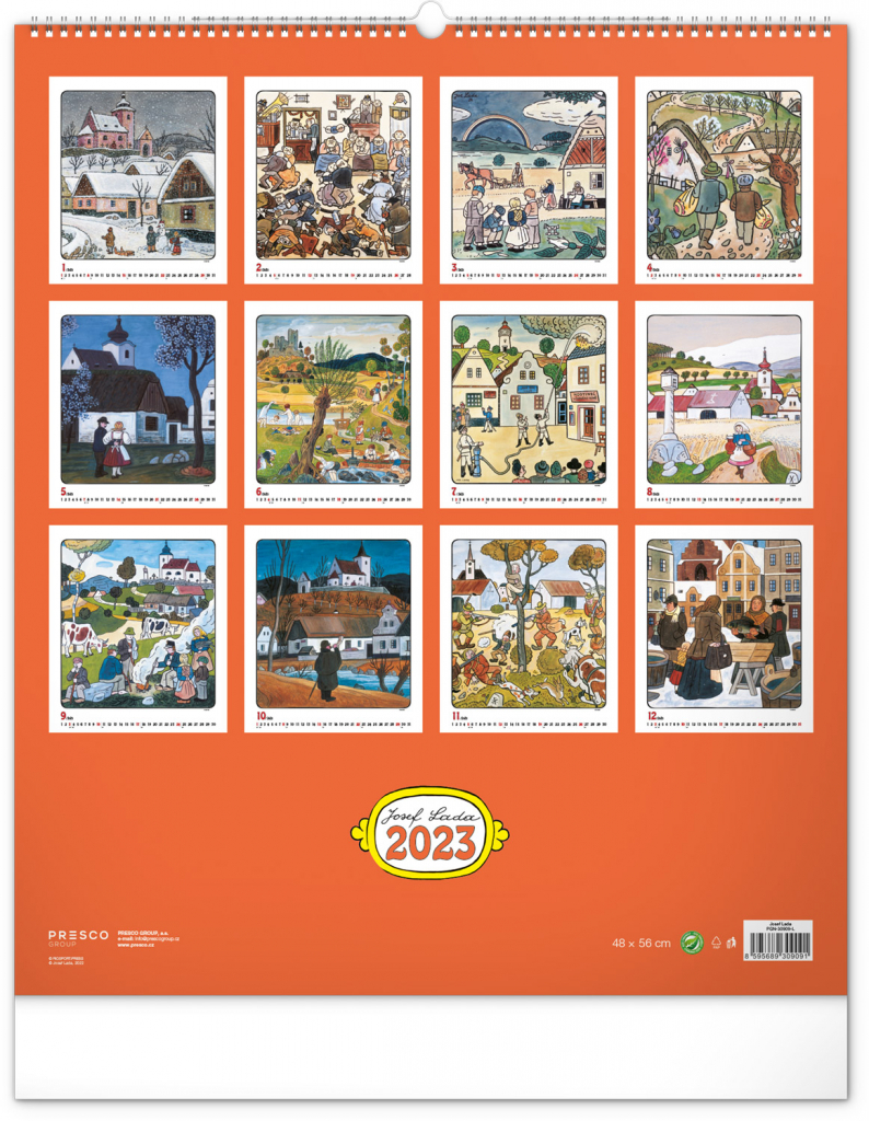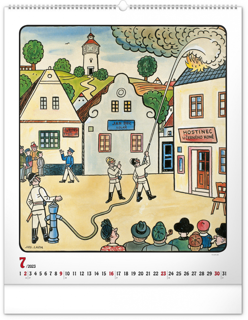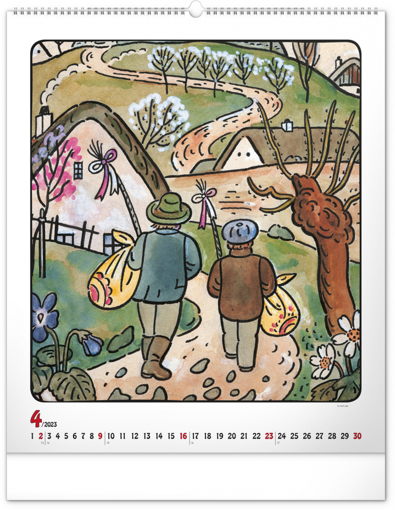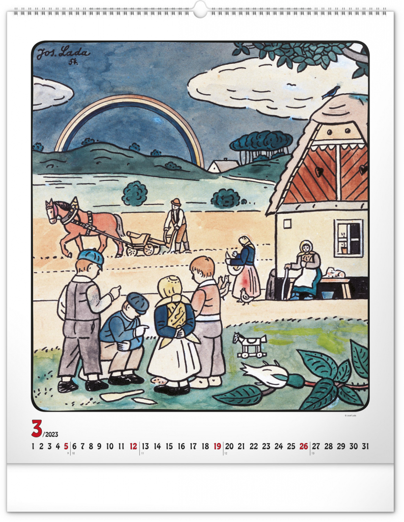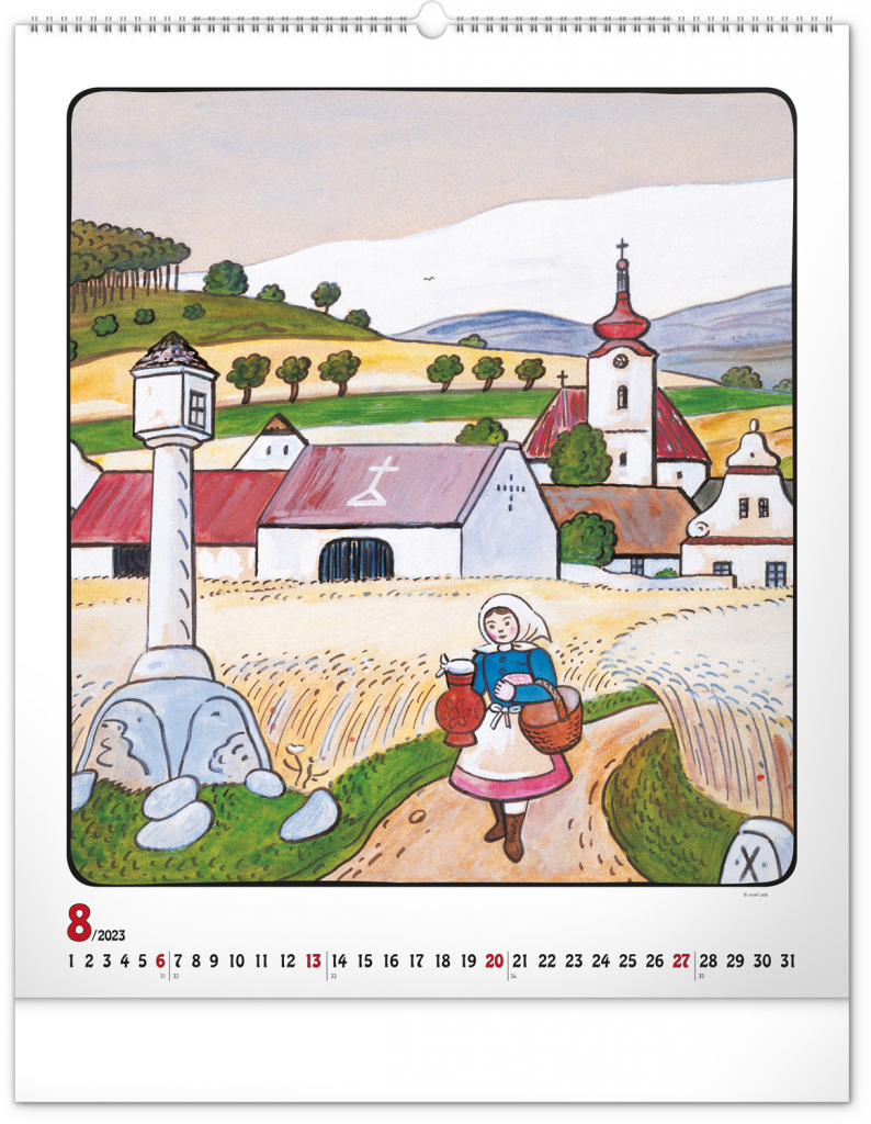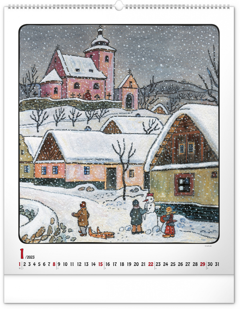 Velkoformátový kalendář s dvanácti ilustracemi Josefa Lady na motivy staročeských řemesel a jednoduchým kalendáriem na bílém pozadí se zvýrazněnými nedělemi.