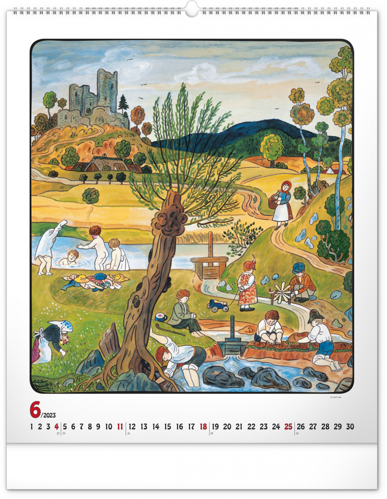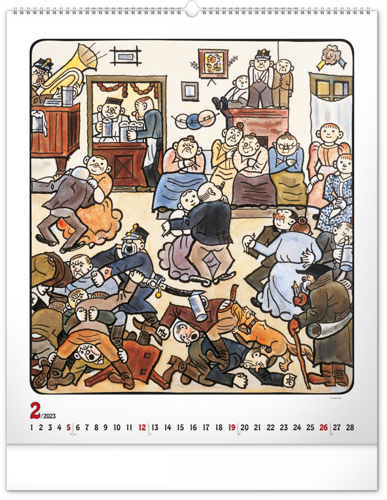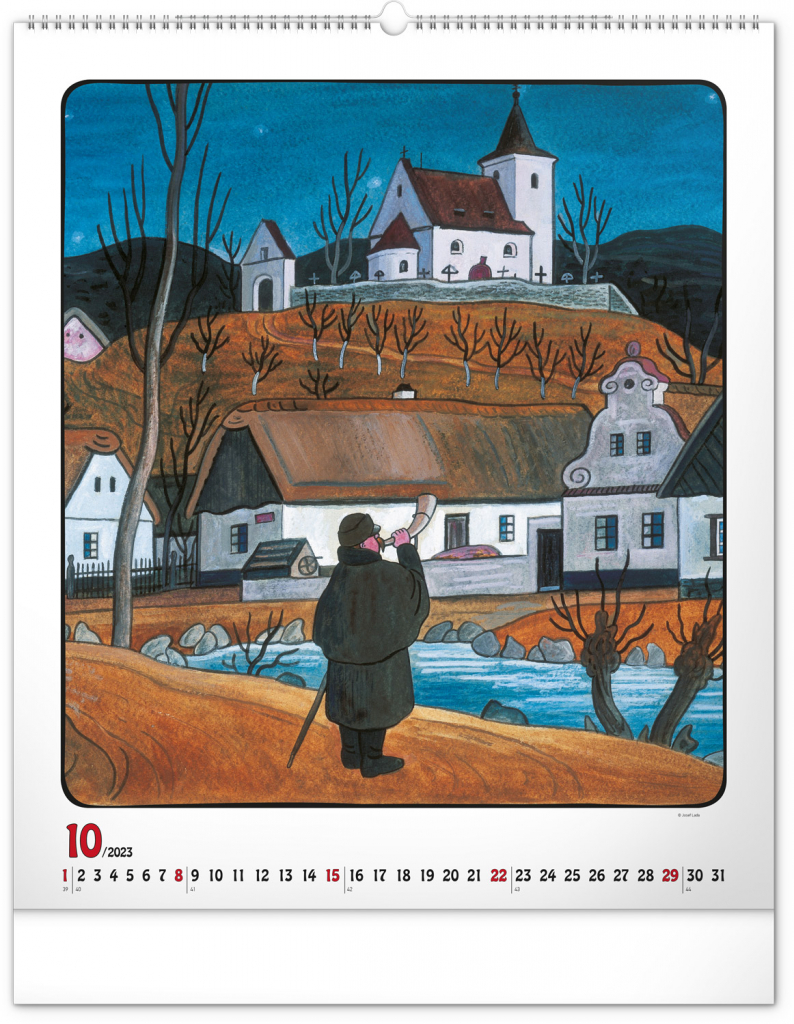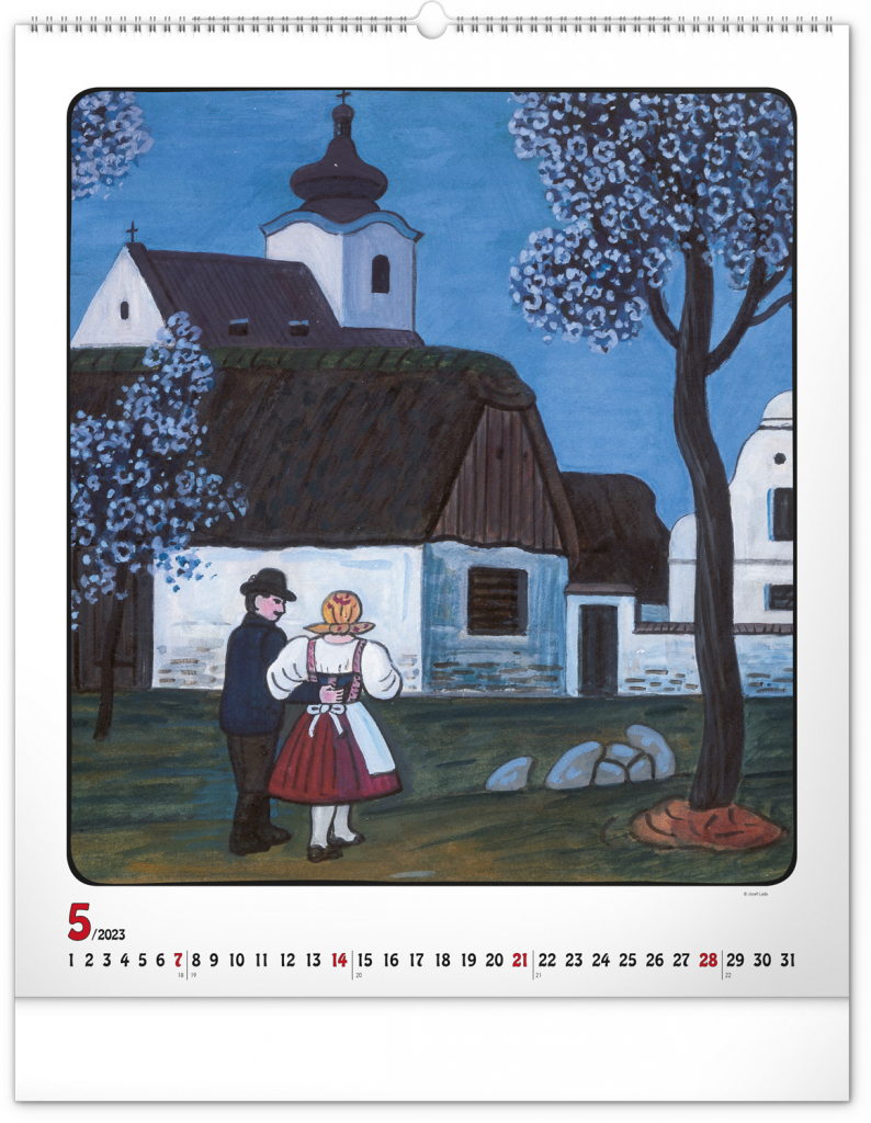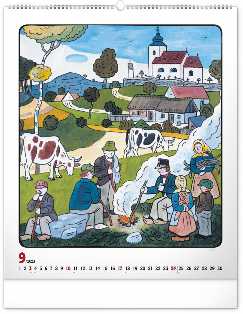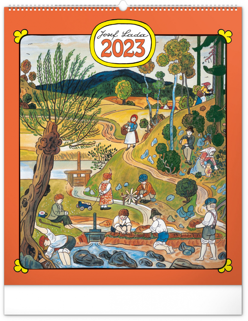 Velkoformátový kalendář s dvanácti ilustracemi Josefa Lady na motivy staročeských řemesel a jednoduchým kalendáriem na bílém pozadí se zvýrazněnými nedělemi.