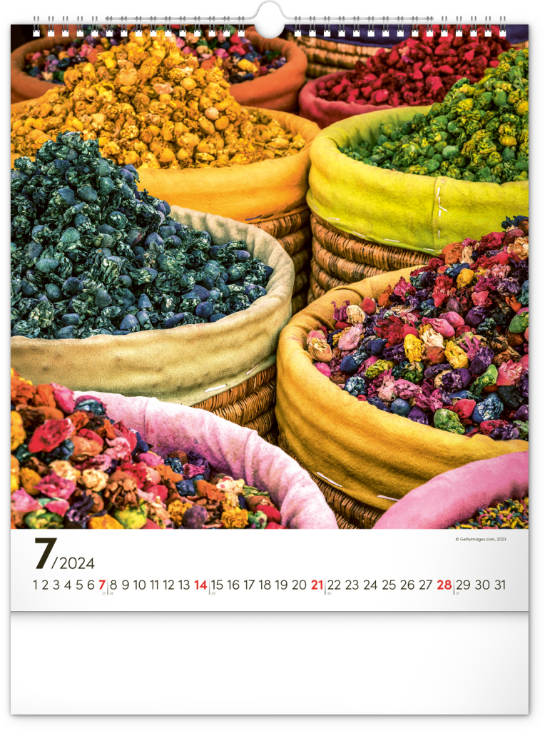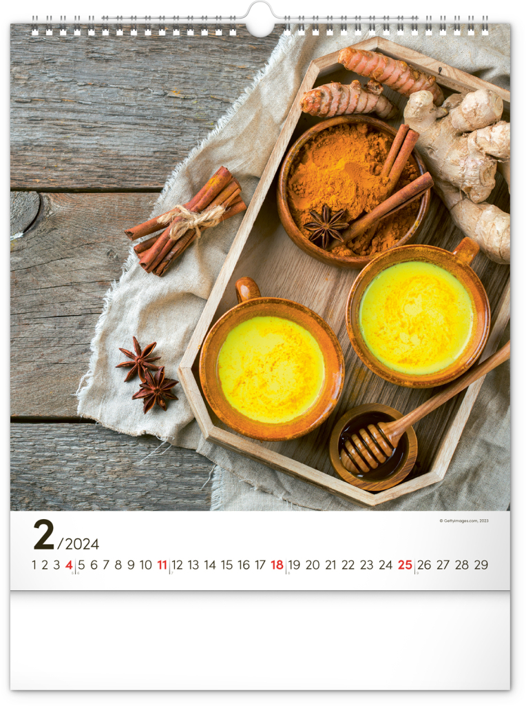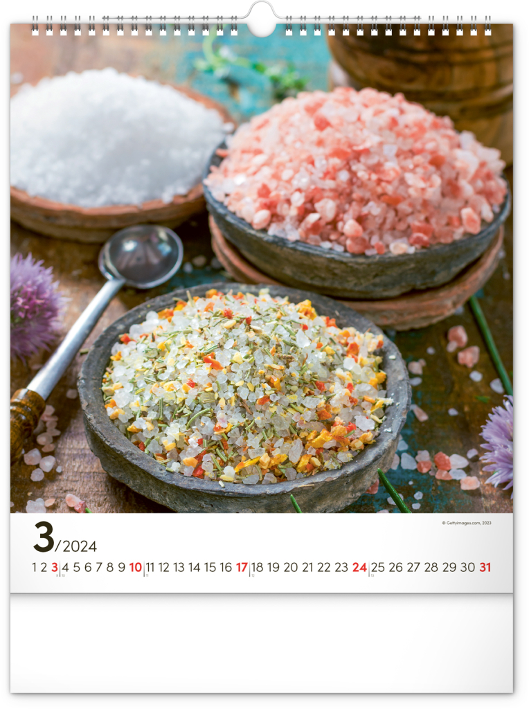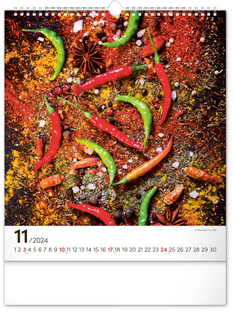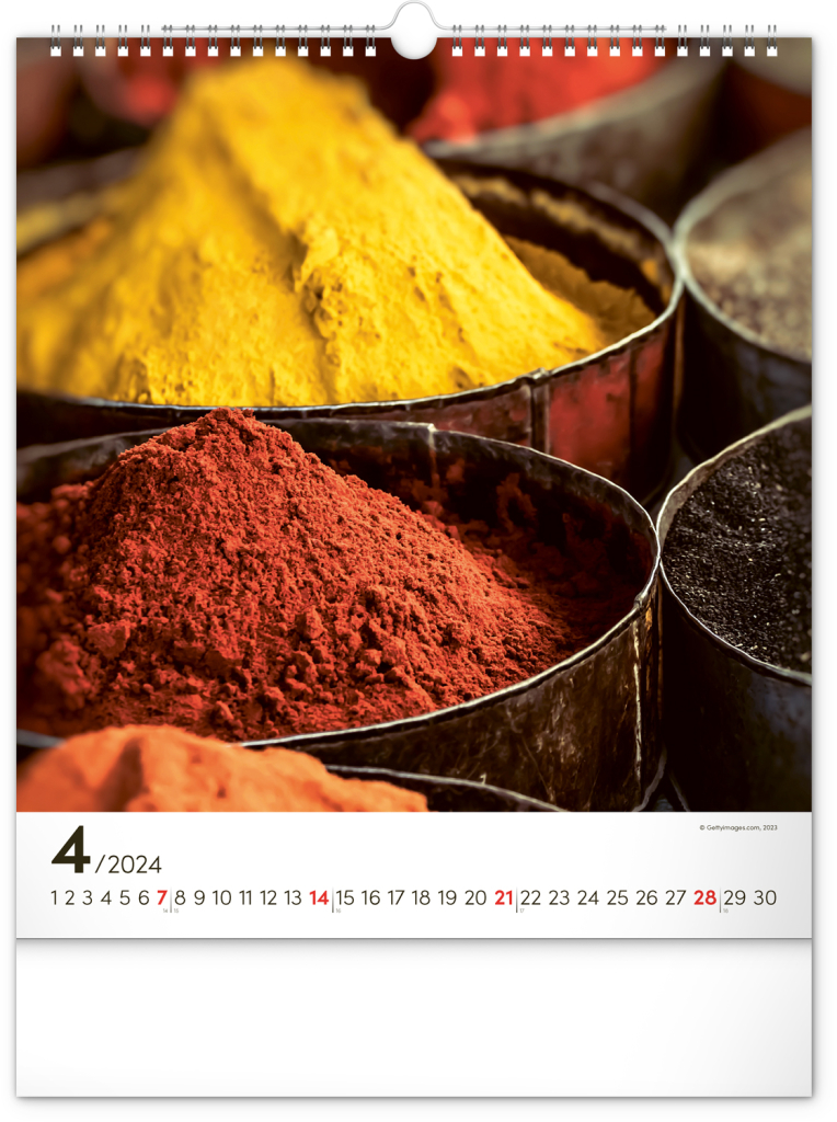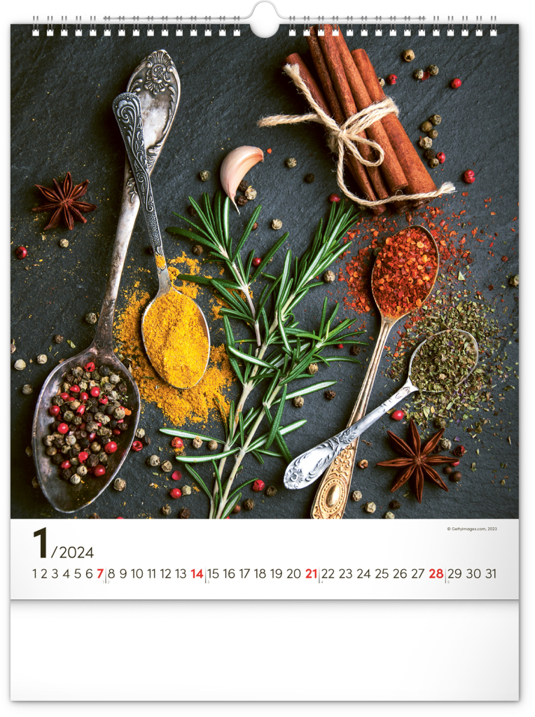 Nástěnný kalendář, který vám prostřednictvím pestrobarevných fotografií koření a bylinek okoření každý den. Fotografie doplňuje univerzální kalendárium na černém pozadí.