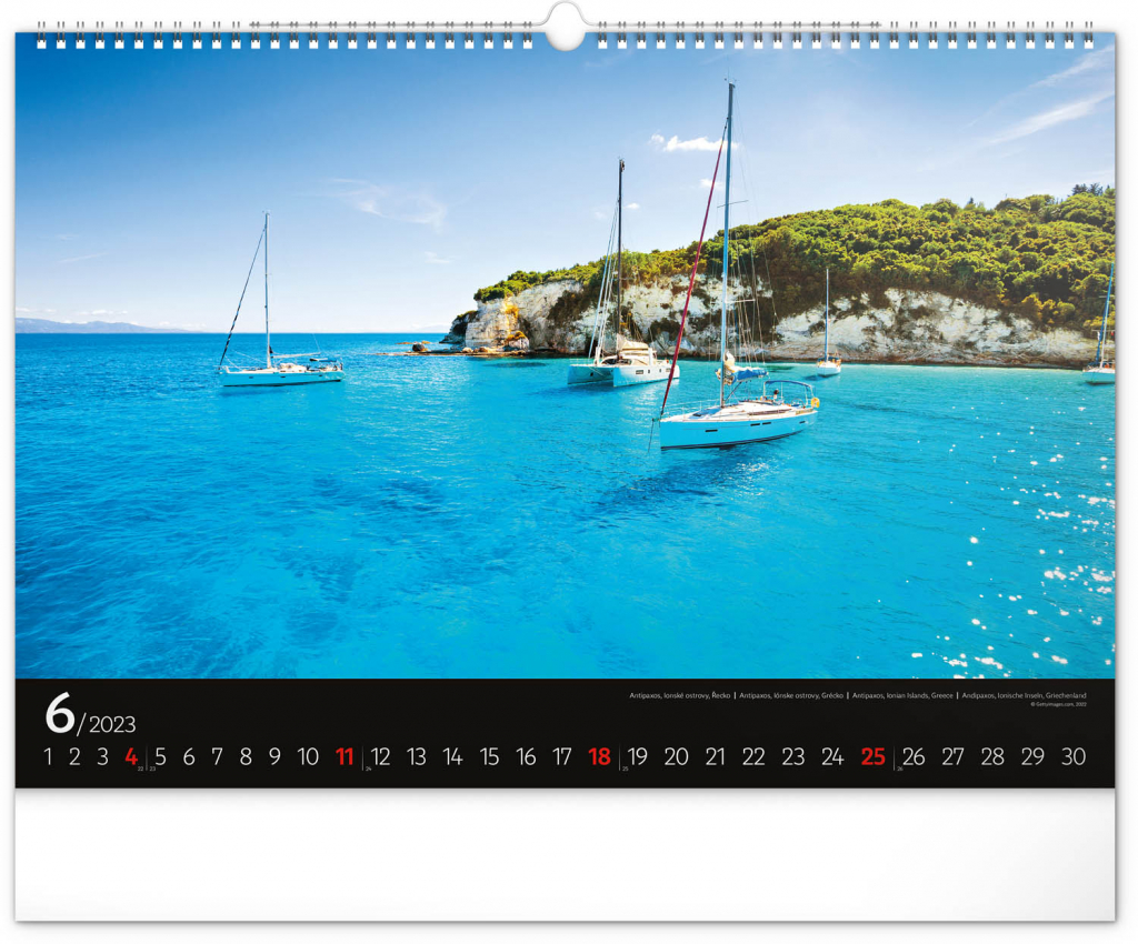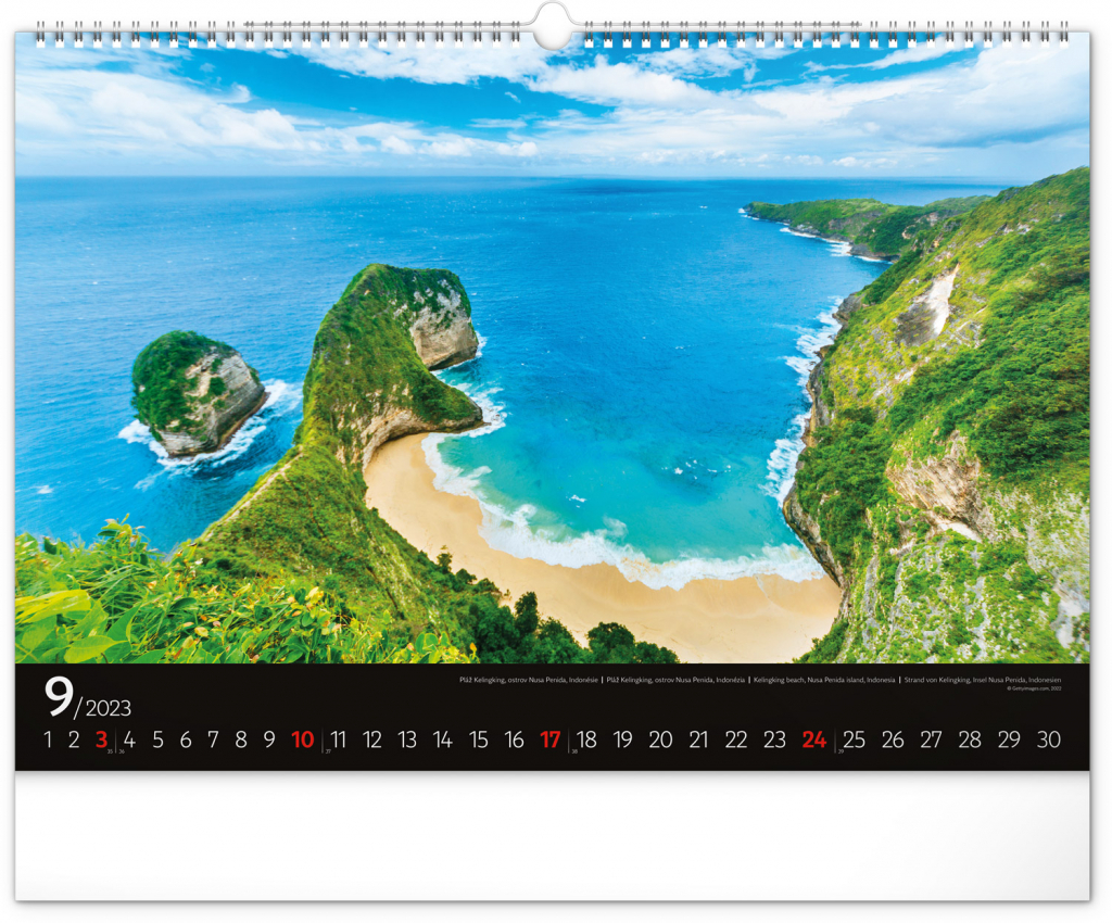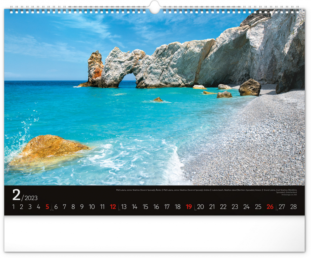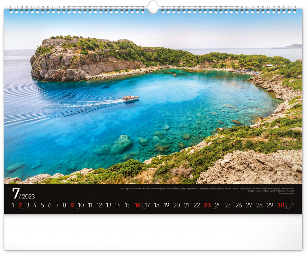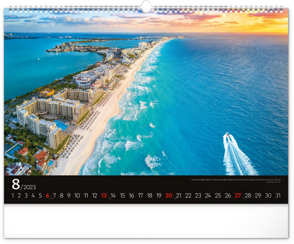 Průzračná tyrkysová hladina, azurové nebe s bílými mráčky, palmy, paprsky slunce, to je skutečný ráj na zemi. Dvanáct plážových momentek z Řecka, Filipín či Mexika na efektním černém pozadí s jednoduchým kalendáriem.