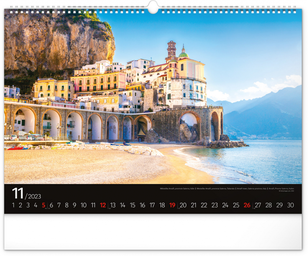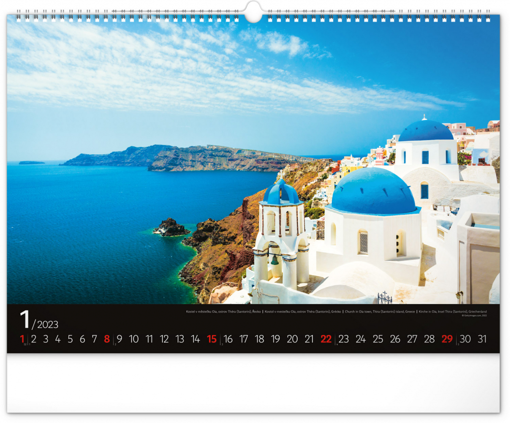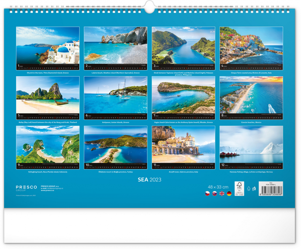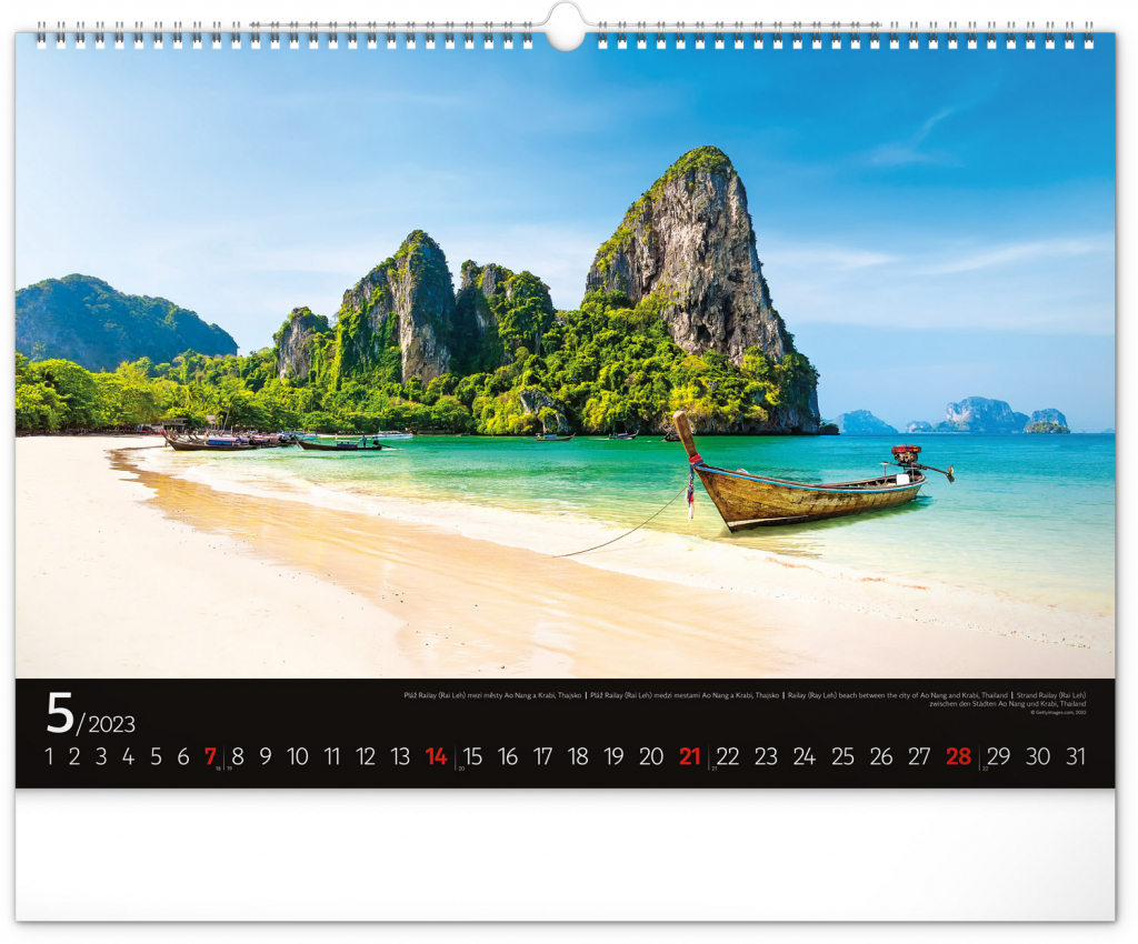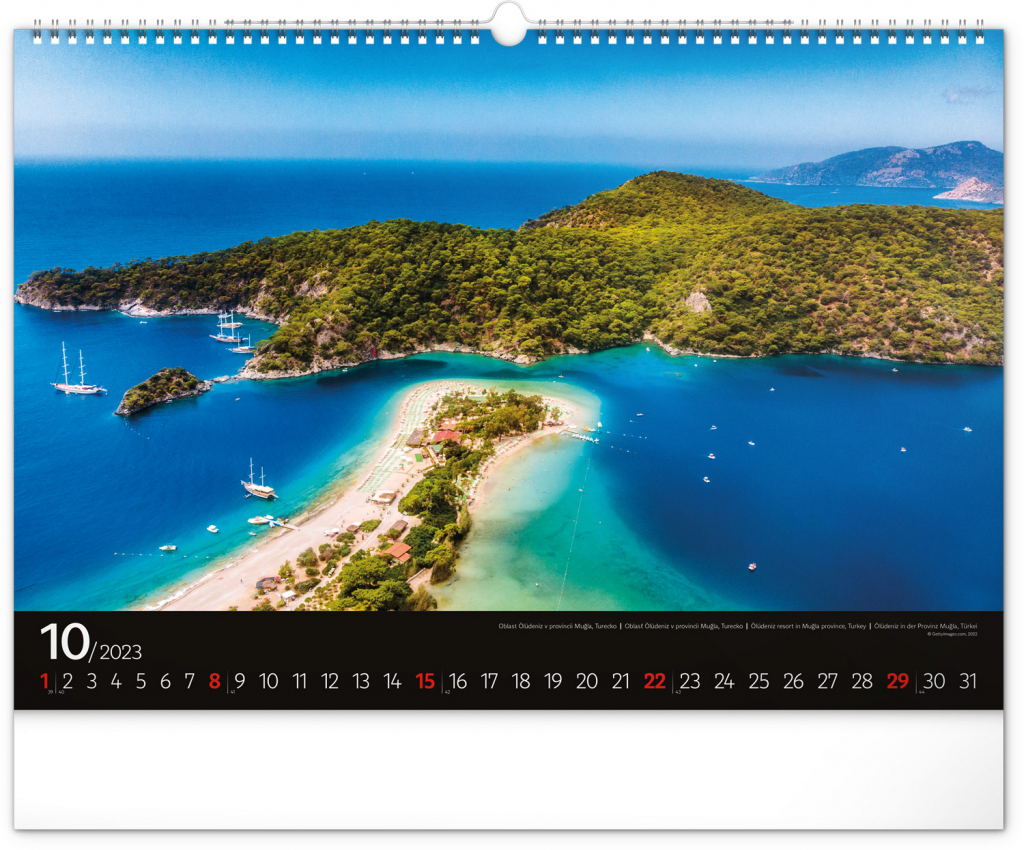 Průzračná tyrkysová hladina, azurové nebe s bílými mráčky, palmy, paprsky slunce, to je skutečný ráj na zemi. Dvanáct plážových momentek z Řecka, Filipín či Mexika na efektním černém pozadí s jednoduchým kalendáriem.